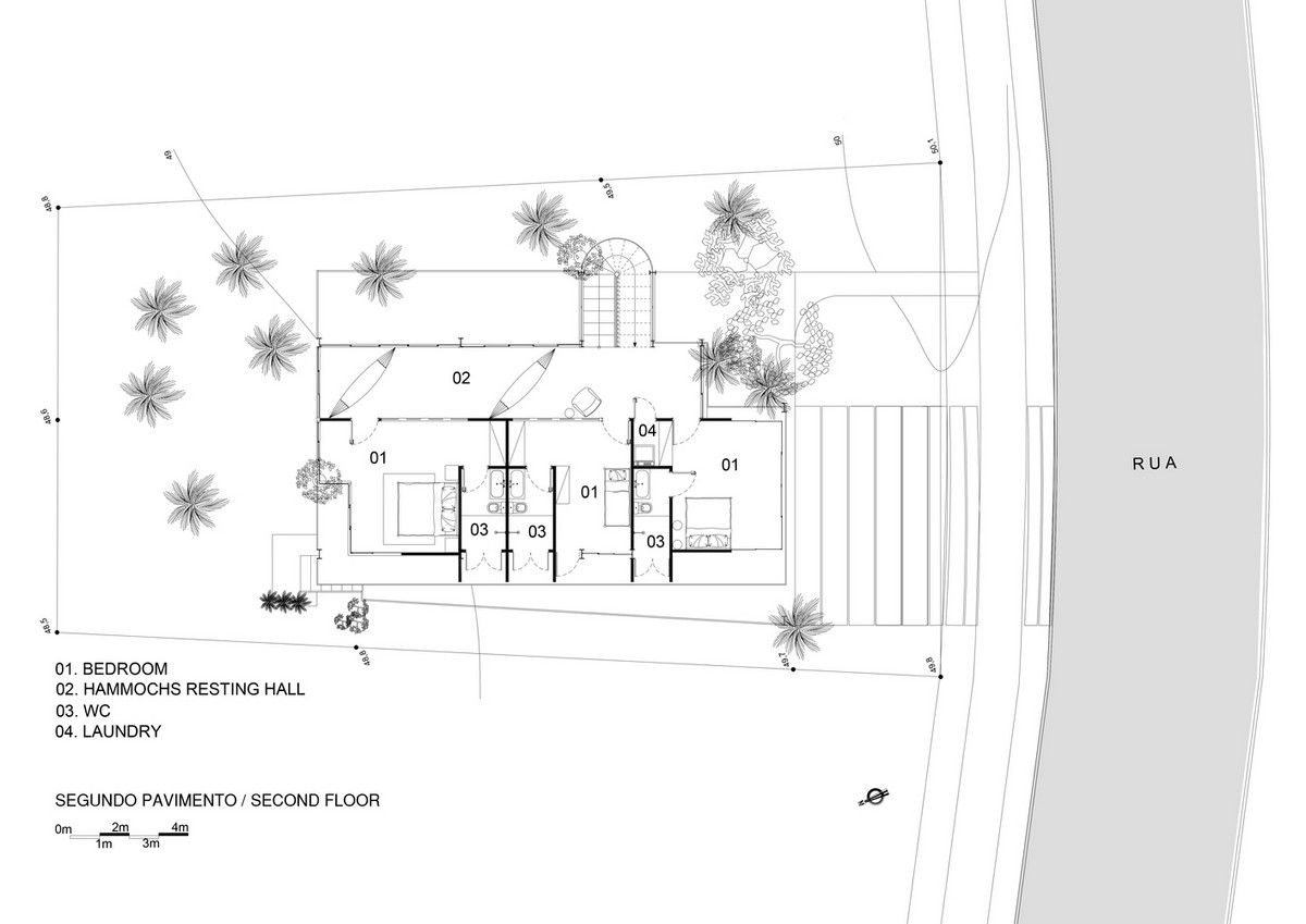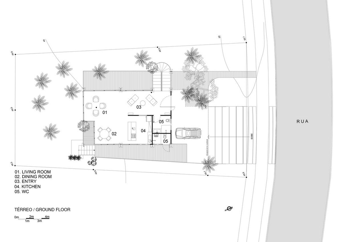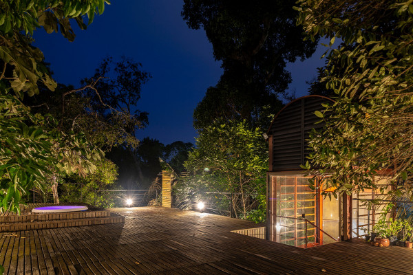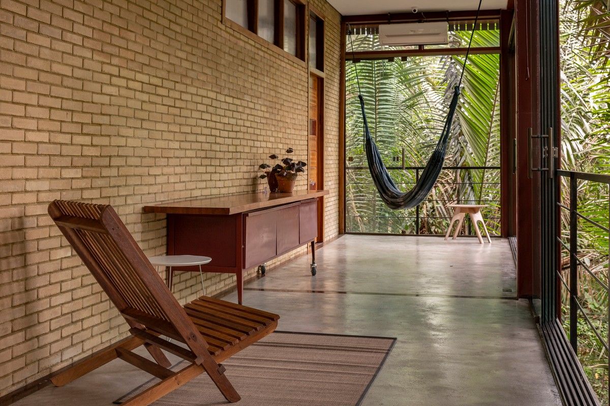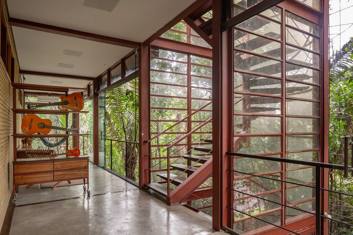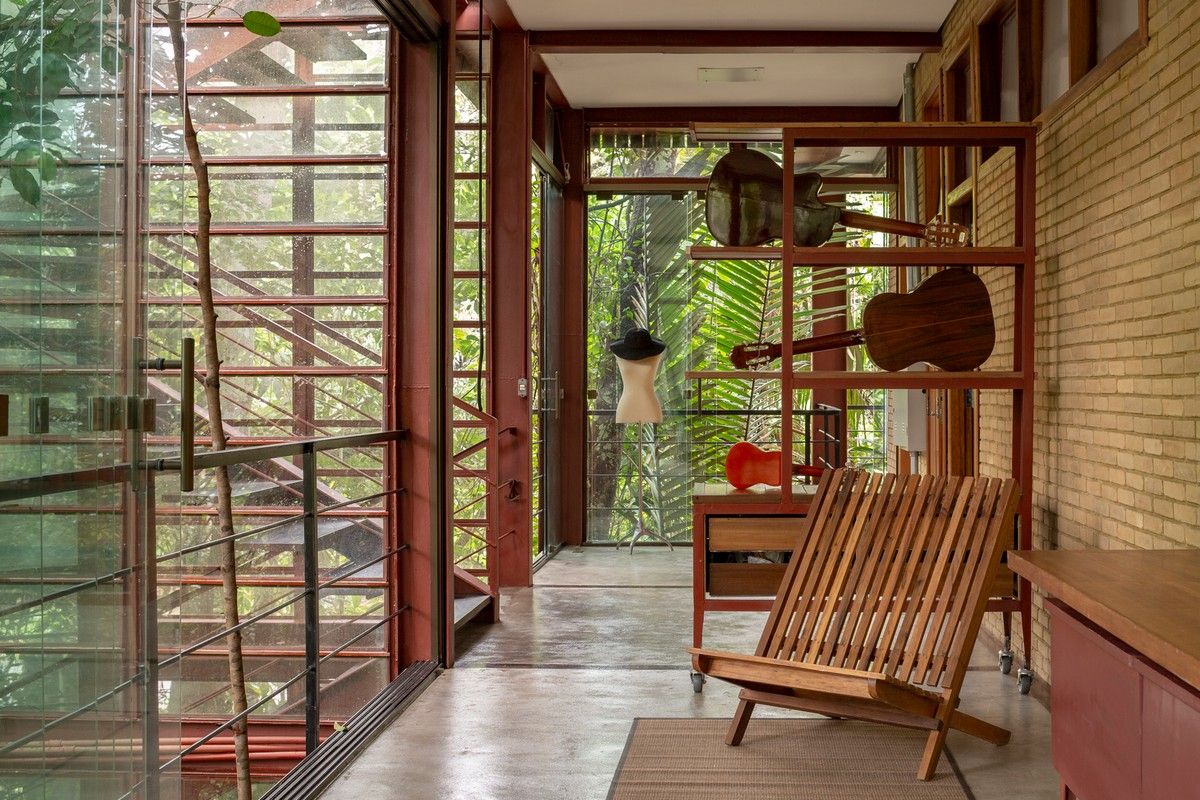 Дом расположен в жилом кондоминиуме в живописном районе Тарума с естественным лесом, ручьями и множеством диких животных. Участок, выделенный под проект, находится на территории сохранившегося посреди городской зоны пышного леса Амазонки, в 25 км от Международного аэропорта имени Эдуарду Гомеша.Основная задача при проектировании и строительстве дома заключалась в максимальном сохранении уникального природного ландшафта и применении естественных процессов вентиляции и освещения здания. С целью отказа от использования тяжелых землеройных машин и сохранения на участке вековых деревьев, выбор был сделан в пользу сборной металлической конструкции объекта, позволяющей соблюсти природоохранные мероприятия.Здание занимает центр участка, где была большая лесная поляна, и выходит на улицу с юго-западной стороны, в то время, как ветер, преимущественно, дует с востока на запад. Конструкция приподнята на сваях на высоте одного метра над естественной местностью, что позволило сохранить корни растущих вокруг деревьев. Пышная зелень тропического леса, плотно окружающая дом, выполняет роль внешних занавесок и обеспечивает необходимую конфиденциальность. Интерьер, оказавшийся "в куполе" буйной зелени, приобретает уникальную характеристику, наполненную природной энергией.Общая площадь двухэтажного дома на одну семью составляет 260 квадратных метров. Первый этаж здания занимает социальная зона открытого плана - гостиная, столовая и кухня. На втором этаже оборудована приватная зона с тремя спальнями и тремя ванными комнатами. На крыше дома оборудована открытая терраса с деревянной палубой и джакузи. Этажи дома соединены панорамной полувинтовой лестницей, которая поднимается вдоль могучих стволов величественных деревьев до террасы, окруженной их пышными кронами. Центральная ось винтовой части лестницы выполнена из 2 металлических труб диаметром 16 см, которые были приобретены на складе по переработке металла в промышленном районе города. Для покрытия лестничной башни была использована часть старого стального желоба диаметром 2,60 метров.Интерьер дома впечатляет естественной простотой и уютом. Часть мебели является эксклюзивной. Для изготовления столешницы для окрашенной стальной конструкции и умывальника была применена древесина уникального дерева ангелим, одного из самых больших деревьев в тропическом лесу, высота которого может достигать50-60 метров, а ствол - 1-1,8 метров в диаметре.