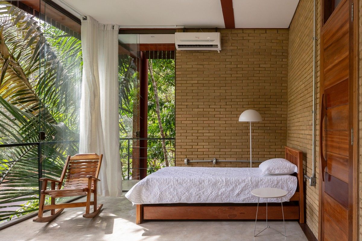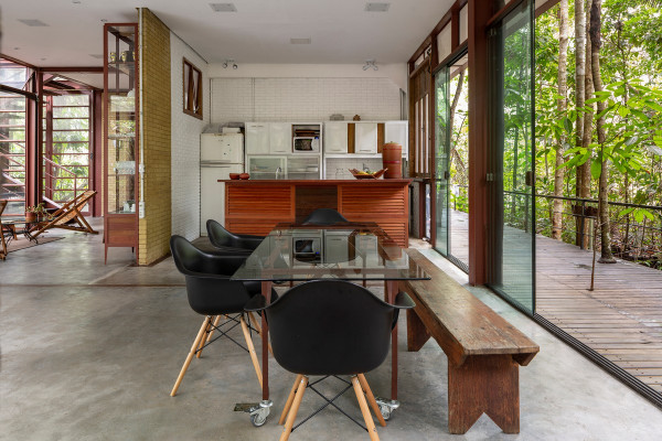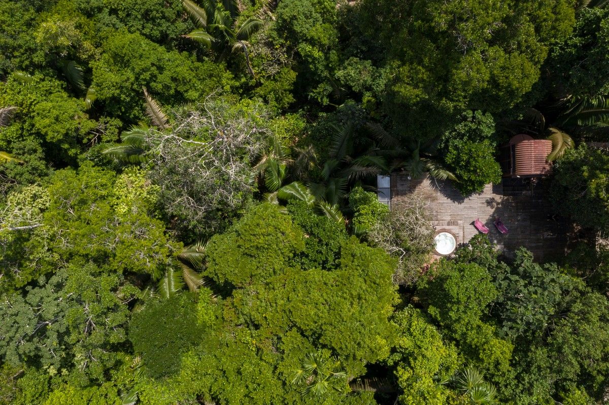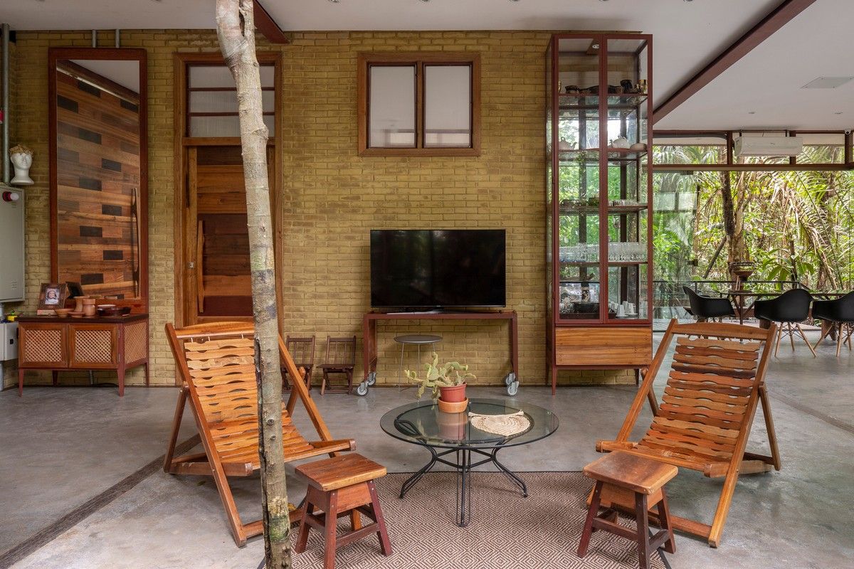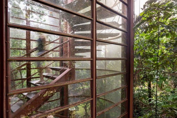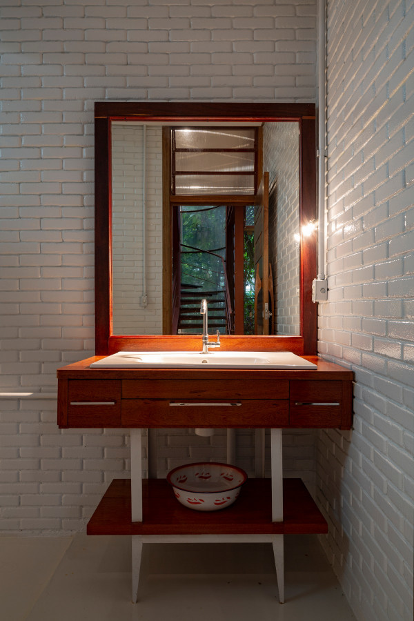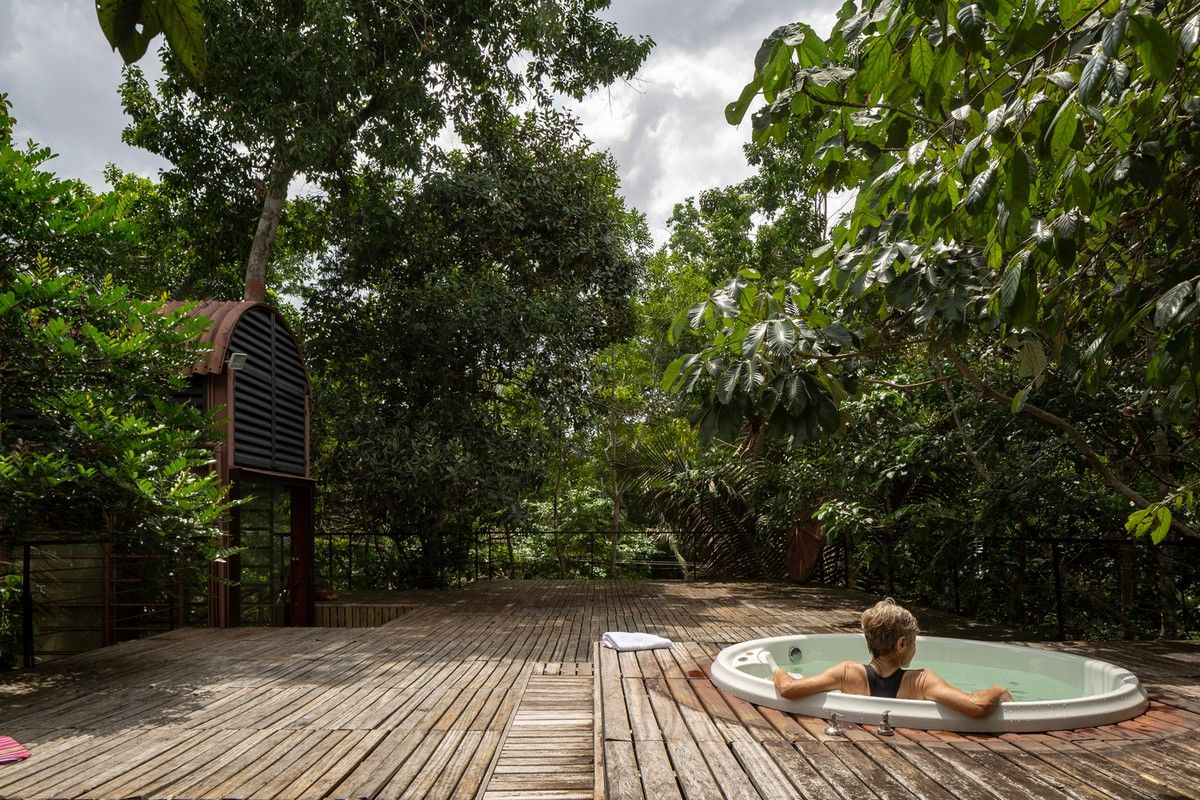 Дом расположен в жилом кондоминиуме в живописном районе Тарума с естественным лесом, ручьями и множеством диких животных. Участок, выделенный под проект, находится на территории сохранившегося посреди городской зоны пышного леса Амазонки, в 25 км от Международного аэропорта имени Эдуарду Гомеша.Основная задача при проектировании и строительстве дома заключалась в максимальном сохранении уникального природного ландшафта и применении естественных процессов вентиляции и освещения здания. С целью отказа от использования тяжелых землеройных машин и сохранения на участке вековых деревьев, выбор был сделан в пользу сборной металлической конструкции объекта, позволяющей соблюсти природоохранные мероприятия.Здание занимает центр участка, где была большая лесная поляна, и выходит на улицу с юго-западной стороны, в то время, как ветер, преимущественно, дует с востока на запад. Конструкция приподнята на сваях на высоте одного метра над естественной местностью, что позволило сохранить корни растущих вокруг деревьев. Пышная зелень тропического леса, плотно окружающая дом, выполняет роль внешних занавесок и обеспечивает необходимую конфиденциальность. Интерьер, оказавшийся "в куполе" буйной зелени, приобретает уникальную характеристику, наполненную природной энергией.Общая площадь двухэтажного дома на одну семью составляет 260 квадратных метров. Первый этаж здания занимает социальная зона открытого плана - гостиная, столовая и кухня. На втором этаже оборудована приватная зона с тремя спальнями и тремя ванными комнатами. На крыше дома оборудована открытая терраса с деревянной палубой и джакузи. Этажи дома соединены панорамной полувинтовой лестницей, которая поднимается вдоль могучих стволов величественных деревьев до террасы, окруженной их пышными кронами. Центральная ось винтовой части лестницы выполнена из 2 металлических труб диаметром 16 см, которые были приобретены на складе по переработке металла в промышленном районе города. Для покрытия лестничной башни была использована часть старого стального желоба диаметром 2,60 метров.Интерьер дома впечатляет естественной простотой и уютом. Часть мебели является эксклюзивной. Для изготовления столешницы для окрашенной стальной конструкции и умывальника была применена древесина уникального дерева ангелим, одного из самых больших деревьев в тропическом лесу, высота которого может достигать50-60 метров, а ствол - 1-1,8 метров в диаметре.