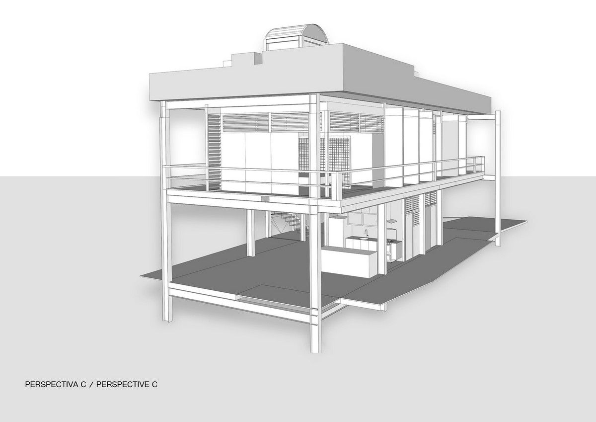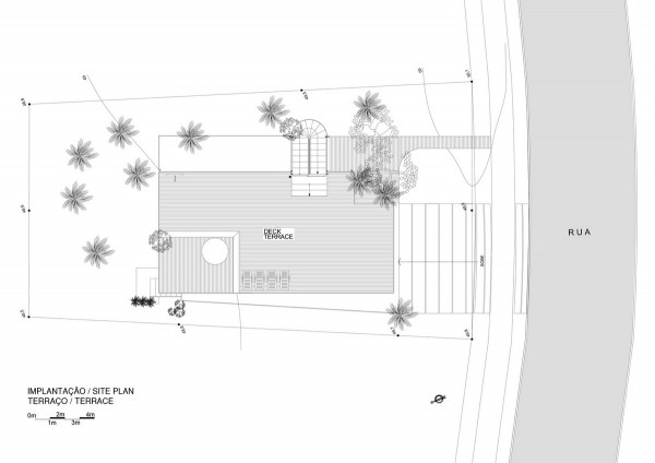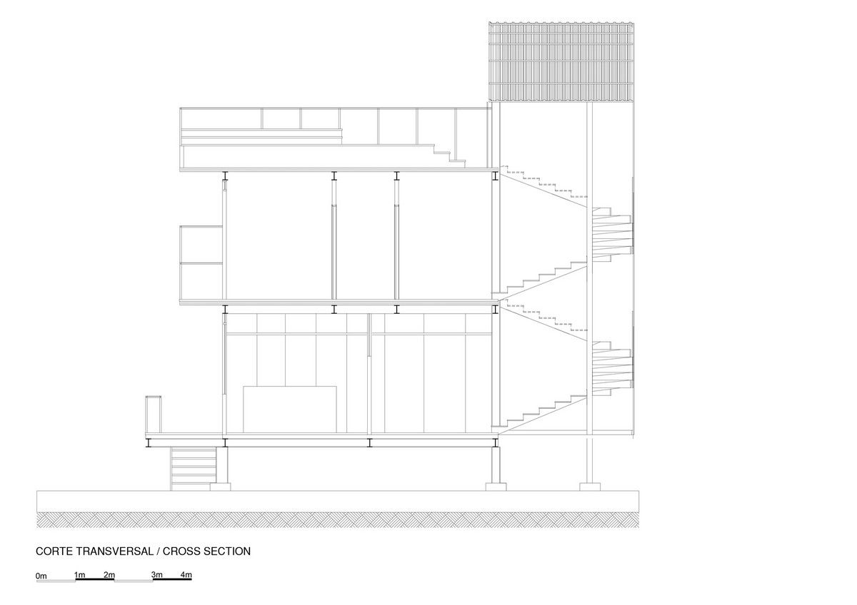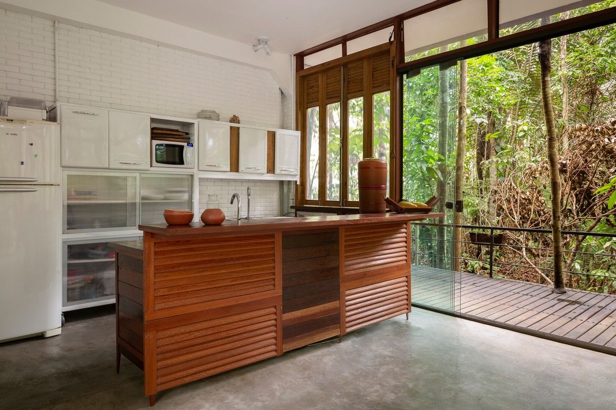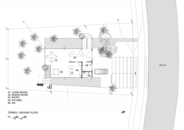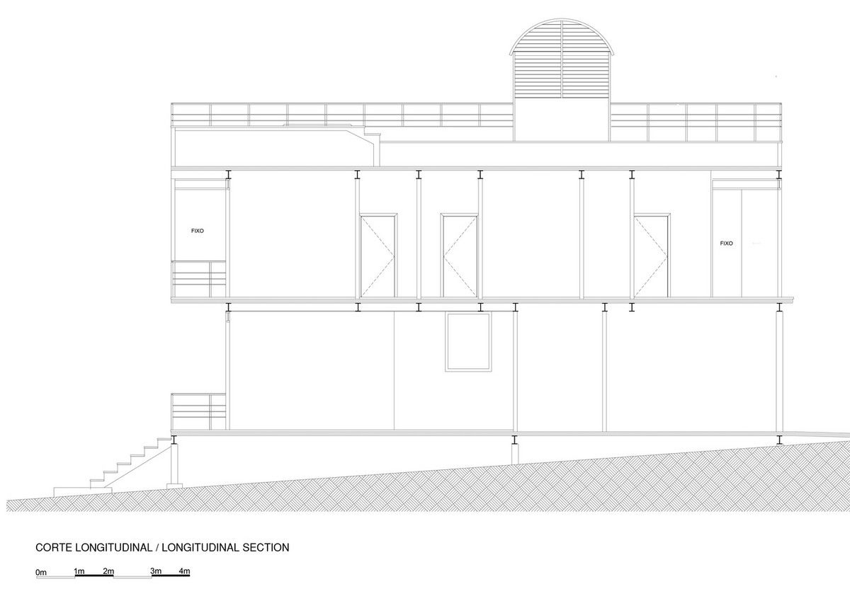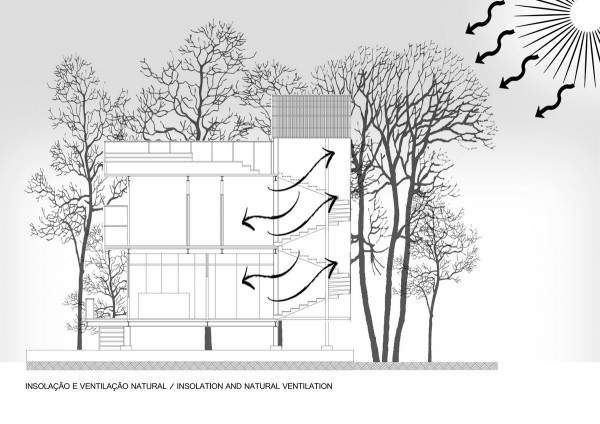 Дом расположен в жилом кондоминиуме в живописном районе Тарума с естественным лесом, ручьями и множеством диких животных. Участок, выделенный под проект, находится на территории сохранившегося посреди городской зоны пышного леса Амазонки, в 25 км от Международного аэропорта имени Эдуарду Гомеша.Основная задача при проектировании и строительстве дома заключалась в максимальном сохранении уникального природного ландшафта и применении естественных процессов вентиляции и освещения здания. С целью отказа от использования тяжелых землеройных машин и сохранения на участке вековых деревьев, выбор был сделан в пользу сборной металлической конструкции объекта, позволяющей соблюсти природоохранные мероприятия.Здание занимает центр участка, где была большая лесная поляна, и выходит на улицу с юго-западной стороны, в то время, как ветер, преимущественно, дует с востока на запад. Конструкция приподнята на сваях на высоте одного метра над естественной местностью, что позволило сохранить корни растущих вокруг деревьев. Пышная зелень тропического леса, плотно окружающая дом, выполняет роль внешних занавесок и обеспечивает необходимую конфиденциальность. Интерьер, оказавшийся "в куполе" буйной зелени, приобретает уникальную характеристику, наполненную природной энергией.Общая площадь двухэтажного дома на одну семью составляет 260 квадратных метров. Первый этаж здания занимает социальная зона открытого плана - гостиная, столовая и кухня. На втором этаже оборудована приватная зона с тремя спальнями и тремя ванными комнатами. На крыше дома оборудована открытая терраса с деревянной палубой и джакузи. Этажи дома соединены панорамной полувинтовой лестницей, которая поднимается вдоль могучих стволов величественных деревьев до террасы, окруженной их пышными кронами. Центральная ось винтовой части лестницы выполнена из 2 металлических труб диаметром 16 см, которые были приобретены на складе по переработке металла в промышленном районе города. Для покрытия лестничной башни была использована часть старого стального желоба диаметром 2,60 метров.Интерьер дома впечатляет естественной простотой и уютом. Часть мебели является эксклюзивной. Для изготовления столешницы для окрашенной стальной конструкции и умывальника была применена древесина уникального дерева ангелим, одного из самых больших деревьев в тропическом лесу, высота которого может достигать50-60 метров, а ствол - 1-1,8 метров в диаметре.