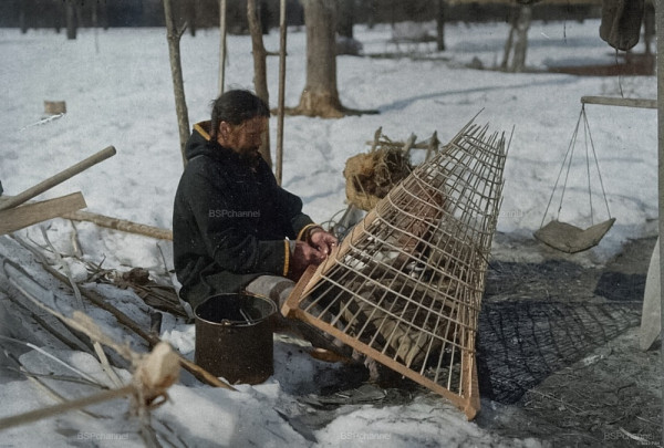 Рыбак за плетением рыбной ловушки гимги (морды), 1914 год. Ханты, ныне Тюменская область, Ханты-Мансийский автономный округ.