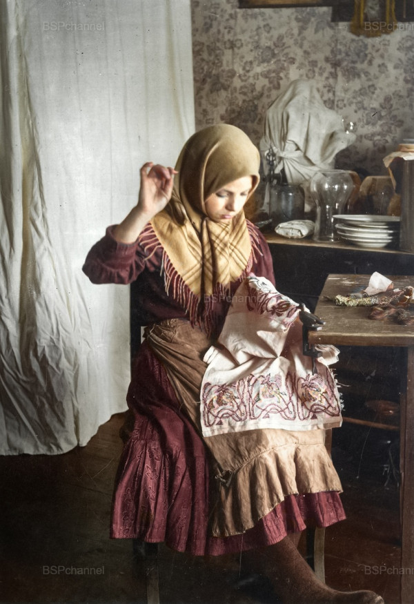 Девочка за вышиванием. Владимирская губерния, 1914 год.