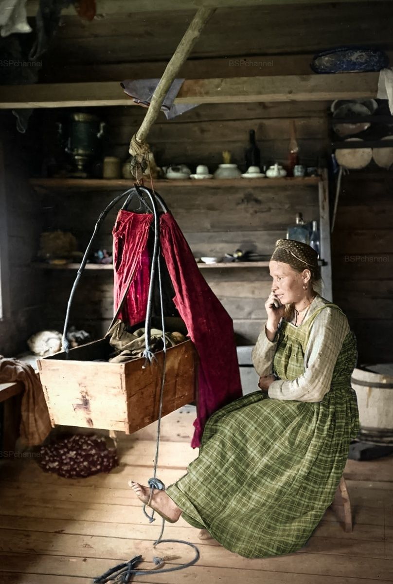 Женщина в избе качает колыбель (зыбку). Архангельская губерния, Архангельский уезд, сел. Яреньга, 1910 год.
