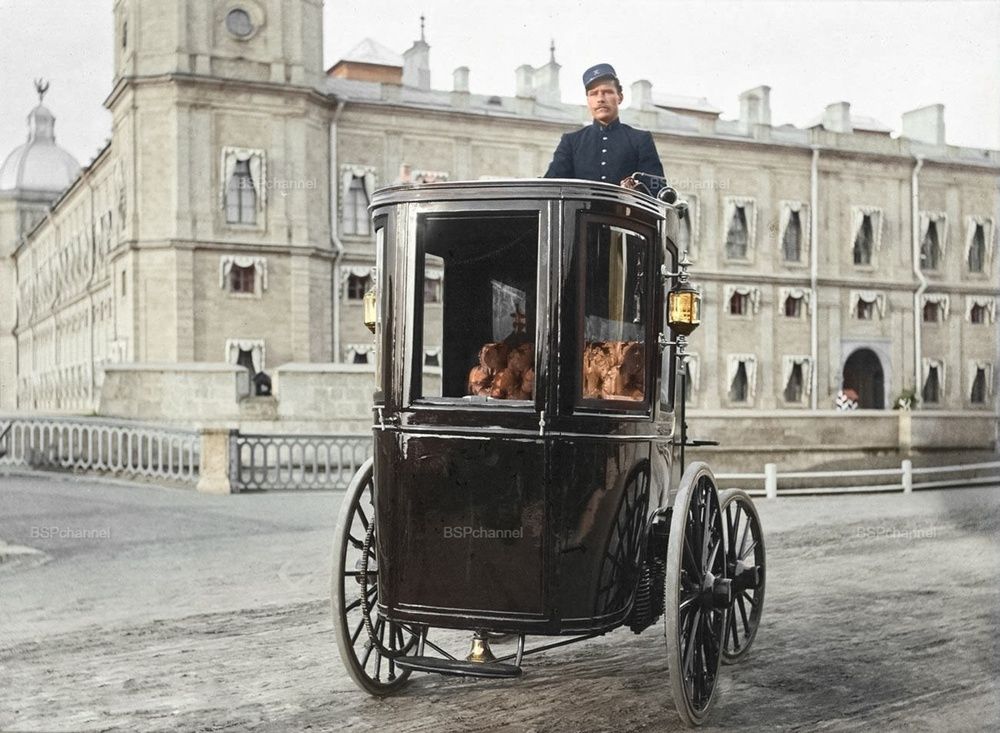 Второй электрокэб конструкции И.В. Романова с закрытым кузовом купе. Гатчина, 1900 год.