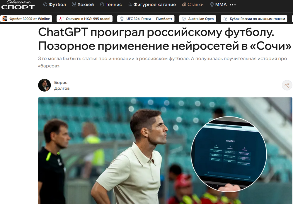 Когда встал вопрос об усилении атаки, Морено снова нажал "Enter". В нейронку загрузили данные трех нападающих (среди которых были Писарский и Мелешин). ChatGPT, проанализировав цифры, ткнул своим виртуальным пальцем в Артура Шушеначева. Результат? Разрыв шаблонов: 10 матчей, ноль голов. Форвард, выбранный алгоритмом, оказался настолько "эффективен", что команда в итоге с грохотом вылетела из РПЛ.Морено продержался в "Сочи" до сентября 2025 года. После того как в семи турах нового сезона команда набрала всего одно очко, терпение руководства лопнуло. Испанец, который когда-то писал книгу "Мой рецепт - 4-4-2", в итоге создал свой новый рецепт: "Как с помощью ChatGPT и бессонницы превратить топ-клуб в аутсайдера Первой лиги".