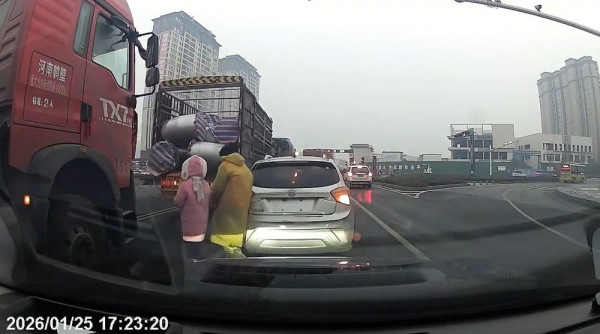 Отец с ребёнком в нарушение ПДД решили перейти многополосную дорогу и зашли они под грузовик. Судя по последующей реакции, они ещё и недовольны остались. Хэби, Китай.