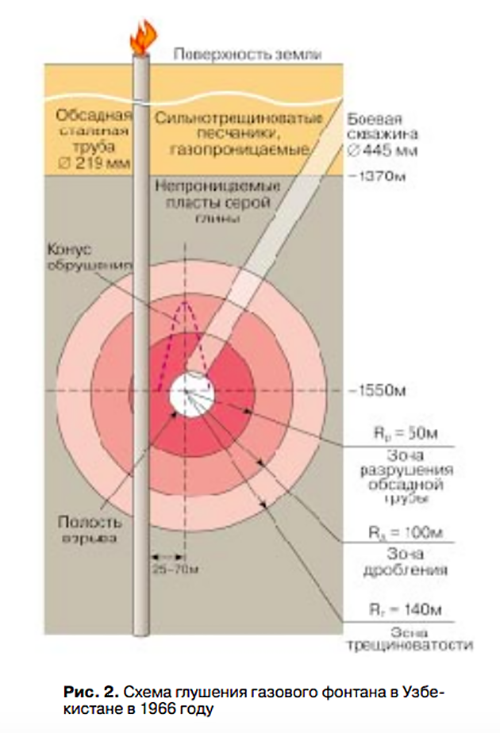 После длительных подготовительных работ, руководил которыми лично министр, трижды Герой и любитель купаний в атомных кратерах Славский, операцию провели 30 сентября 1966 года.В девять утра 30 сентября его подорвали, а еще через 23 секунды фонтан, по свидетельству очевидцев, ревевший как сотни реактивных двигателей, исчез. Это был фантастический успех, колоссальная инженерная победа.Все, кто присутствовал при взрыве, ощутили очень сильное землетрясение, и буквально через 22 секунды дьявольский факел погас. Тонны породы надёжно запечатали газ в толще земли. Наука восторжествовала над природой. Но советским учёным было не до отдыха, сразу же после взрыва в воздух были подняты вертолёты, ведь необходимо было визуально подтвердить, что не произошло прорыва радиоактивных газов.В последующие годы подобным образом были потушены еще два аналогичных аварийных фонтана в Узбекистане и Туркменистане, но не всегда подобные операции заканчивались удачно. В 1972 году провалом завершилась попытка потушить газовый факел в густонаселенной местности в Харьковской области. Взорванное устройство мощностью 3,8 килотонны не смогло закрыть выброс, и его пришлось ликвидировать традиционными способами. Спустя 9 лет, в 1981-м, под Нарьян-Маром, в европейской части РСФСР активация ядерного заряда мощностью 36,8 килотонны не просто не перекрыла аварийную скважину, а наоборот, усилила фонтанирование с 800 тыс. кубометров газоконденсата в сутки до 1,7 млн.