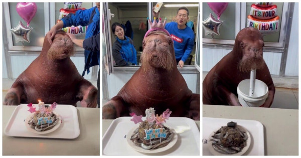 Морж, обитающий в китайском зоопарке, отметил 8-й день рождения. В честь праздника сотрудники учреждения подготовили для животного различные угощения.
