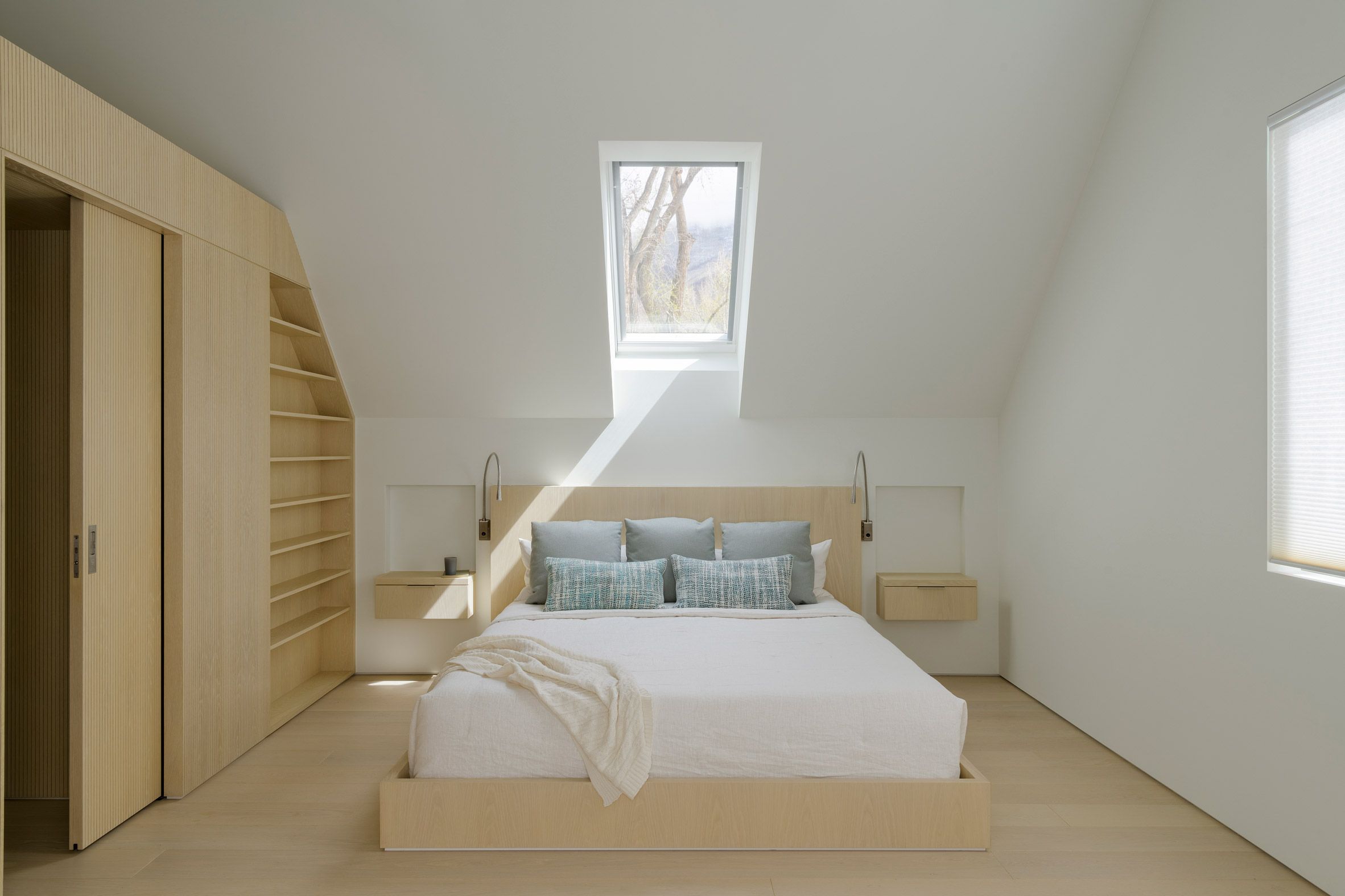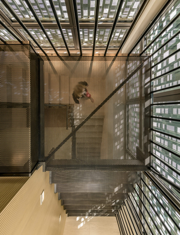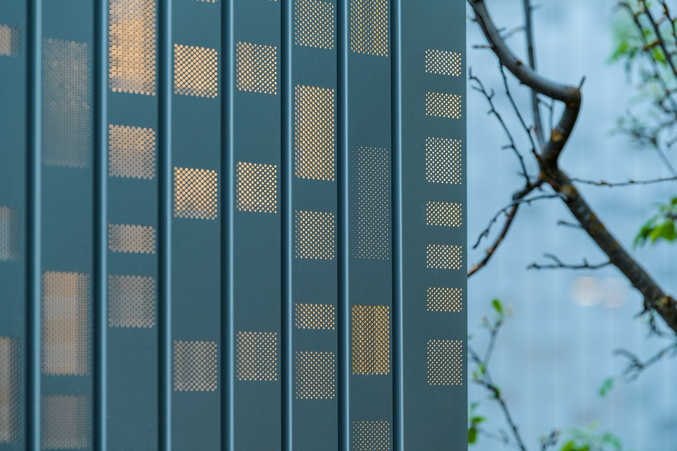 Архитекторы сохранили оригинальные обгоревшие балки в главном остроконечном доме и изменили дизайн жилых помещений, чтобы они стали более просторными. В отдельной двускатной пристройке, называемой Music Box, находится гостевой дом, который также служит местом для проведения фортепианных концертов. Двери выходят во внутренний дворик между пристройкой и главным домом, так что жители могут проводить выступления на открытом воздухе с видом на горы. Перфорированный металлический фасад позволяет свету проникать в музыкальную комнату с трёх сторон, закрывая при этом менее привлекательные виды на переулок. "Этот скин был вдохновлён одним из любимых музыкальных произведений клиента, - сказали в CCY Architects. - Он отделяется от конструкции через решётчатую систему, которая не прерывает перфорированную мелодию. Кожа пропускает свет, но сохраняет конфиденциальность для тех, кто находится внутри".В качестве материала для фасада использован тонкий стальной лист Galvalume с защитным покрытием из алюминия и цинка. Перфорированная стальная лестница позволяет видеть световые узоры, образующиеся на фасаде, со всех трёх сторон лестничной клетки. Архитекторы позаботились о сохранении пропорций Музыкальной шкатулки, аналогичных пропорциям главного дома, чтобы сохранить наследие 19-го века. Снесена пристройка 1970-х годов. Первоначальное сооружение было ненадолго поднято, чтобы создать новый фундамент и подвал, прежде чем его снова поместили на место, где оно было раньше. Все оригинальные материалы дома были оставлены на месте, в том числе обгоревшие балки, а раздвижные створчатые окна были тщательно отреставрированы. Новая лестница была построена из металлической сетки.