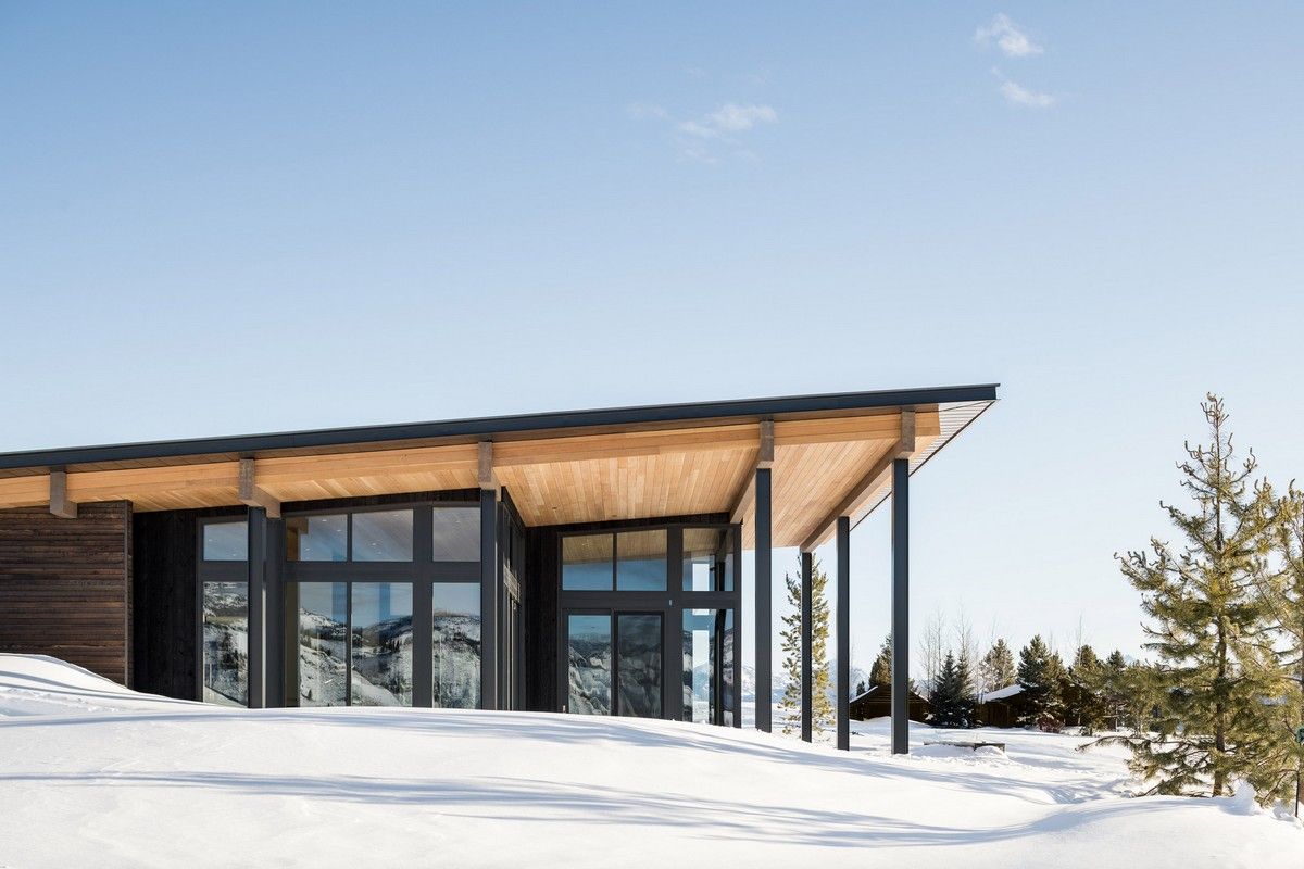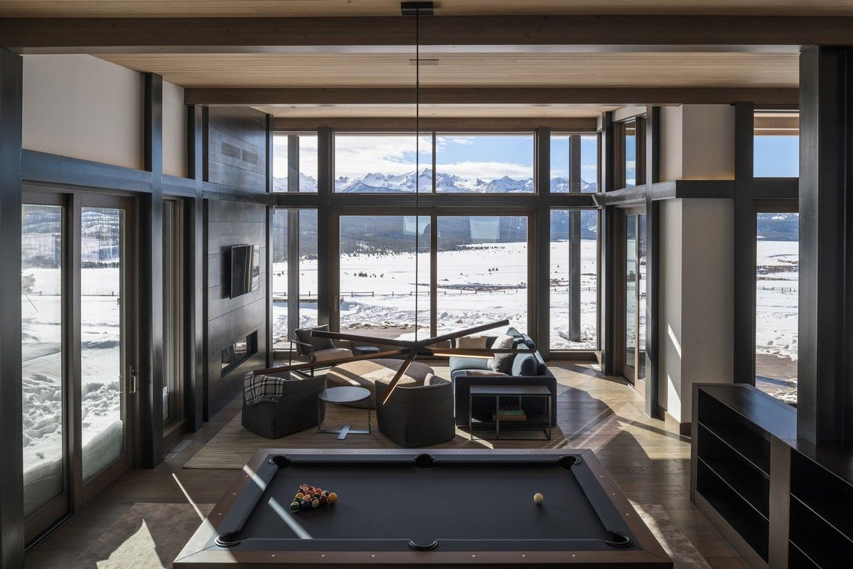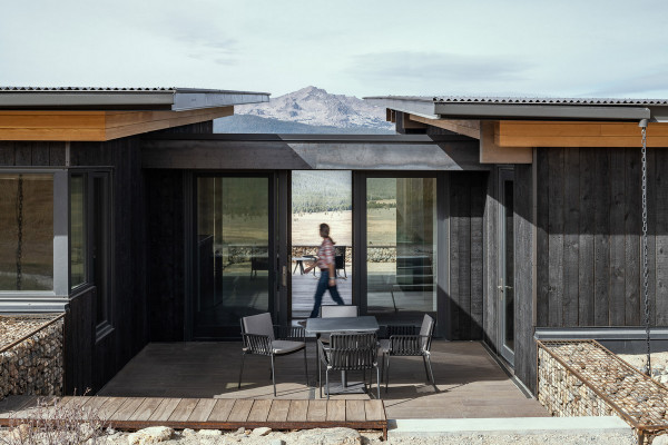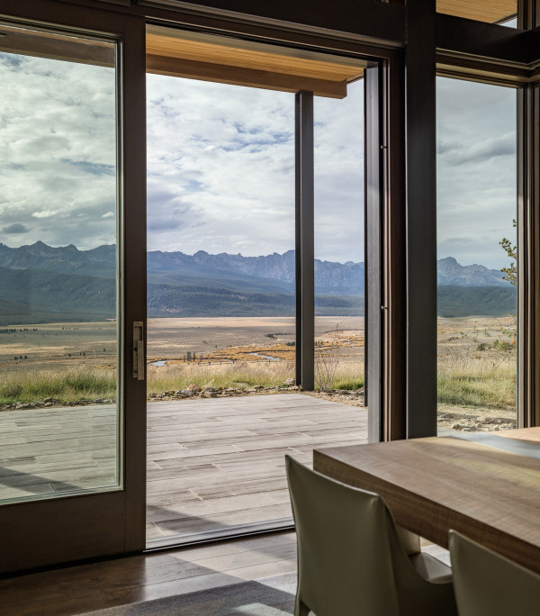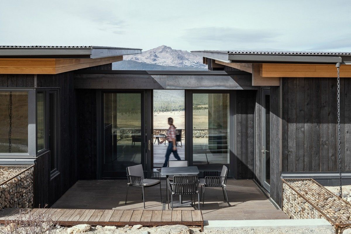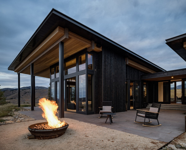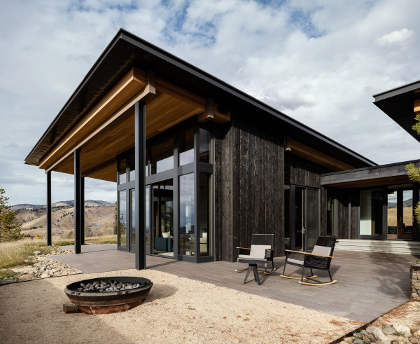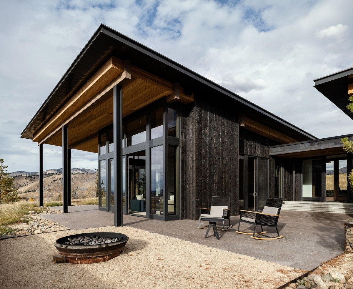 Из-за удаленности от небольшого городка Стэнли, архитекторы хотели свести к минимуму необходимость привозить или уносить строительные материалы. Когда фундамент дома был заложен, камни были повторно использованы для строительства подпорных стен на участке. "Камень в извлечённом материале был отделён от естественной почвы и использован для габионов, - сказал Майкл Доти в описании проекта. - Родные травы и природные особенности ландшафта помогают смягчить переход между полынью и покрытым травой склоном холма к дому". Остальные стены облицованы деревянными досками, которые обожжены до чёрного цвета с использованием традиционной японской техники, известной как "Шоу Суги Бан" (Shou Sugi Ban), чтобы сделать их устойчивыми к гниению и огню. Чёрная гофрированная металлическая крыша завершает монохромный экстерьер дома, а нижняя сторона отделана более светлым деревом.Архитекторы разделили резиденцию на три объёма, чтобы разделить разные функции. Одна занята гостиной, кухней и столовой, четыре спальни расположены в другой, а в третьей размещается гараж. Каждый блок закрыт для уединения, предлагая захватывающий вид на отдаленные окрестности. Области между ними создают множество вариантов для отдыха на открытом воздухе, некоторые из которых частично защищены широкой нависающей крышей. Доступ в дом осуществляется через центральный стеклянный объём, который отделяет спальный блок от основной жилой зоны. Здесь кухня и бар с непринужденной обстановкой занимают половину этажа с пандусом, ведущим в столовую и гостиную. Из-за пологого наклона крыши в этих помещениях высокие потолки. Раздвижные двери во всю высоту ведут на заднюю террасу с местом для костра. Минималистичная палитра чёрных стальных колонн и открытых деревянных балок продолжается внутри, наряду с тёмно-серой металлической мебелью и высоким камином.