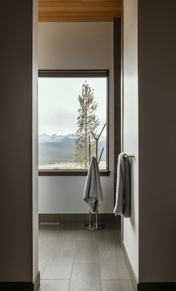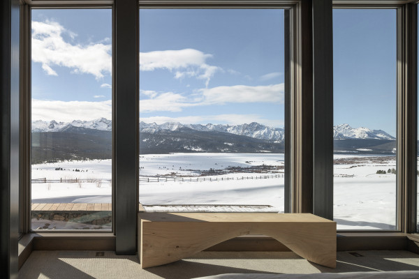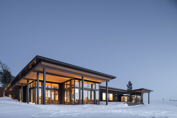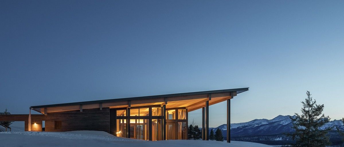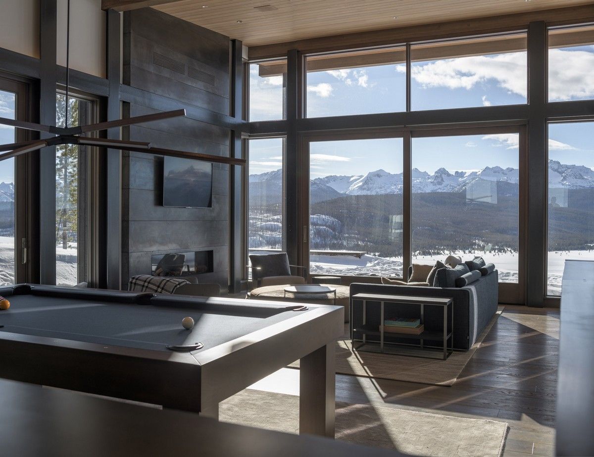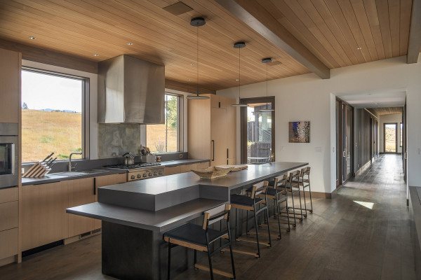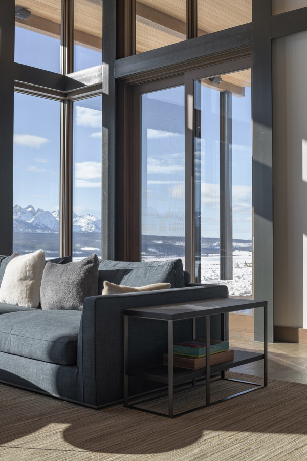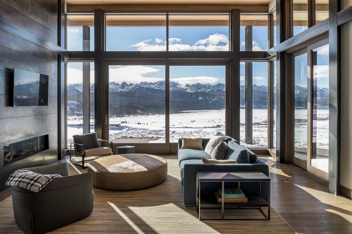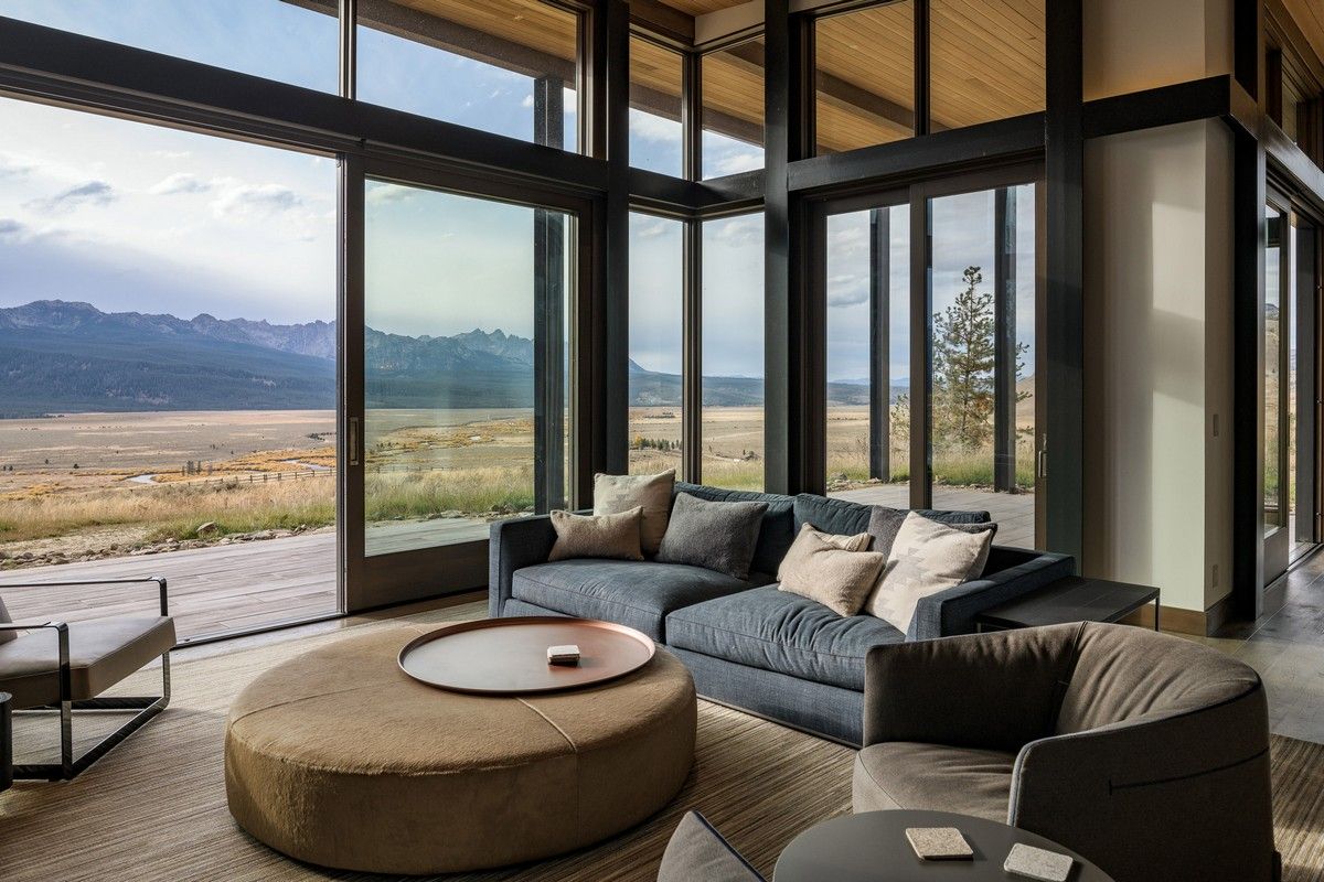 Из-за удаленности от небольшого городка Стэнли, архитекторы хотели свести к минимуму необходимость привозить или уносить строительные материалы. Когда фундамент дома был заложен, камни были повторно использованы для строительства подпорных стен на участке. "Камень в извлечённом материале был отделён от естественной почвы и использован для габионов, - сказал Майкл Доти в описании проекта. - Родные травы и природные особенности ландшафта помогают смягчить переход между полынью и покрытым травой склоном холма к дому". Остальные стены облицованы деревянными досками, которые обожжены до чёрного цвета с использованием традиционной японской техники, известной как "Шоу Суги Бан" (Shou Sugi Ban), чтобы сделать их устойчивыми к гниению и огню. Чёрная гофрированная металлическая крыша завершает монохромный экстерьер дома, а нижняя сторона отделана более светлым деревом.Архитекторы разделили резиденцию на три объёма, чтобы разделить разные функции. Одна занята гостиной, кухней и столовой, четыре спальни расположены в другой, а в третьей размещается гараж. Каждый блок закрыт для уединения, предлагая захватывающий вид на отдаленные окрестности. Области между ними создают множество вариантов для отдыха на открытом воздухе, некоторые из которых частично защищены широкой нависающей крышей. Доступ в дом осуществляется через центральный стеклянный объём, который отделяет спальный блок от основной жилой зоны. Здесь кухня и бар с непринужденной обстановкой занимают половину этажа с пандусом, ведущим в столовую и гостиную. Из-за пологого наклона крыши в этих помещениях высокие потолки. Раздвижные двери во всю высоту ведут на заднюю террасу с местом для костра. Минималистичная палитра чёрных стальных колонн и открытых деревянных балок продолжается внутри, наряду с тёмно-серой металлической мебелью и высоким камином.