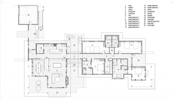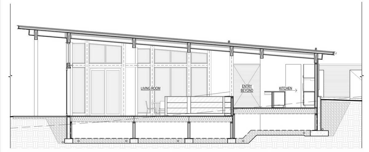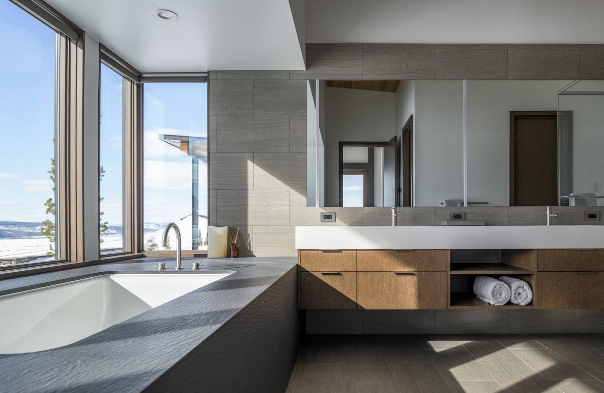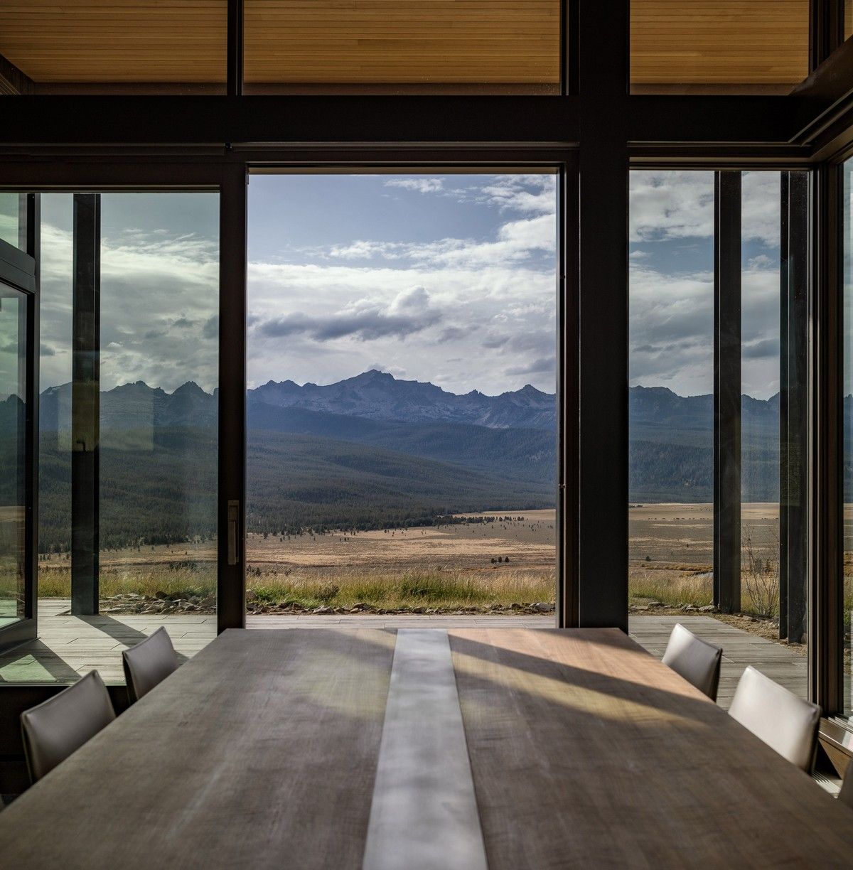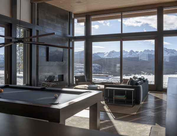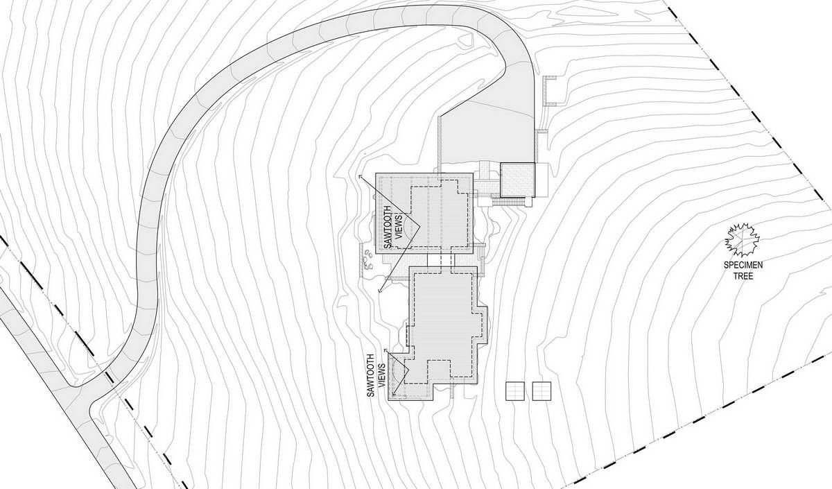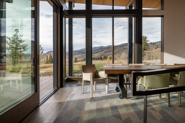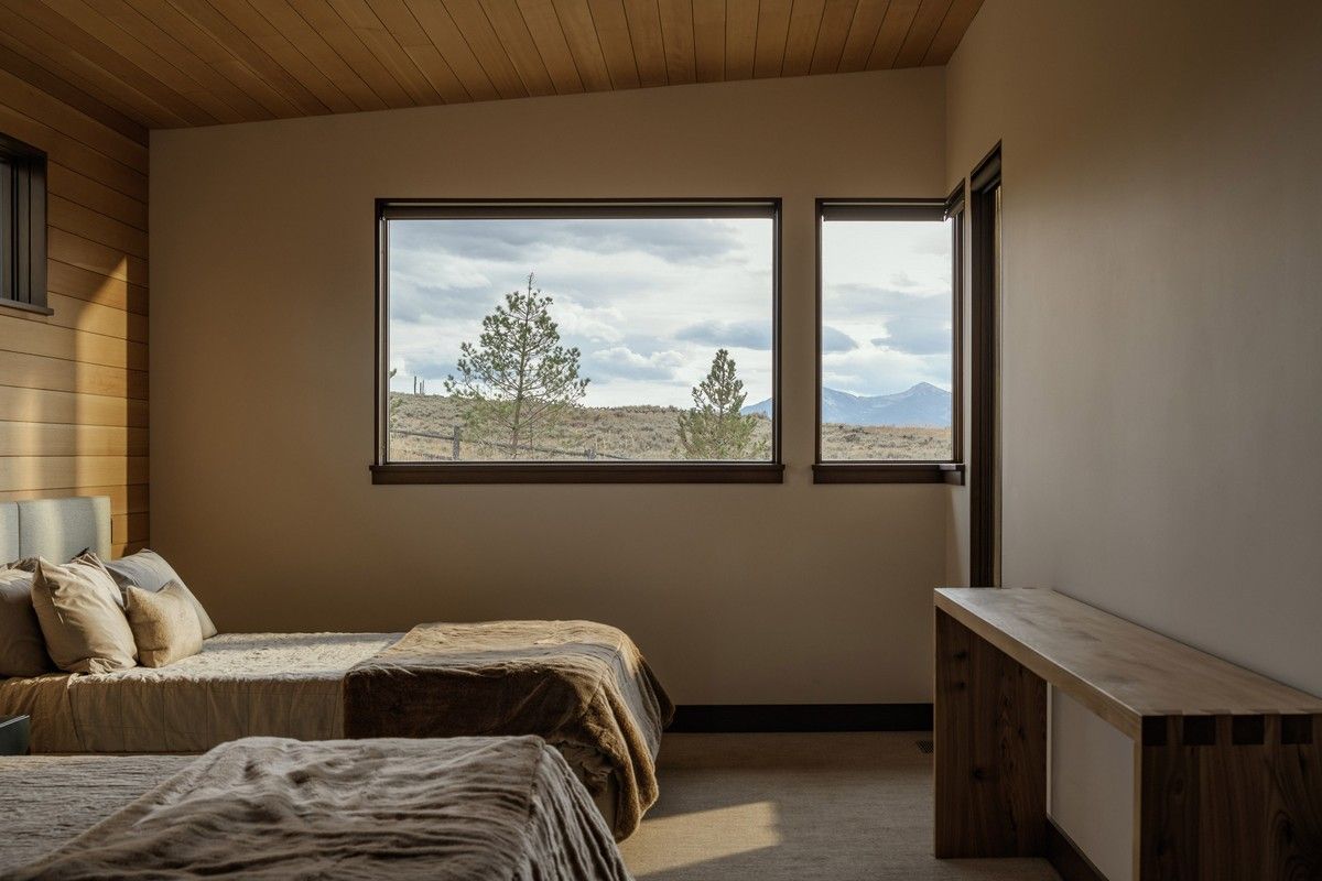 Из-за удаленности от небольшого городка Стэнли, архитекторы хотели свести к минимуму необходимость привозить или уносить строительные материалы. Когда фундамент дома был заложен, камни были повторно использованы для строительства подпорных стен на участке. "Камень в извлечённом материале был отделён от естественной почвы и использован для габионов, - сказал Майкл Доти в описании проекта. - Родные травы и природные особенности ландшафта помогают смягчить переход между полынью и покрытым травой склоном холма к дому". Остальные стены облицованы деревянными досками, которые обожжены до чёрного цвета с использованием традиционной японской техники, известной как "Шоу Суги Бан" (Shou Sugi Ban), чтобы сделать их устойчивыми к гниению и огню. Чёрная гофрированная металлическая крыша завершает монохромный экстерьер дома, а нижняя сторона отделана более светлым деревом.Архитекторы разделили резиденцию на три объёма, чтобы разделить разные функции. Одна занята гостиной, кухней и столовой, четыре спальни расположены в другой, а в третьей размещается гараж. Каждый блок закрыт для уединения, предлагая захватывающий вид на отдаленные окрестности. Области между ними создают множество вариантов для отдыха на открытом воздухе, некоторые из которых частично защищены широкой нависающей крышей. Доступ в дом осуществляется через центральный стеклянный объём, который отделяет спальный блок от основной жилой зоны. Здесь кухня и бар с непринужденной обстановкой занимают половину этажа с пандусом, ведущим в столовую и гостиную. Из-за пологого наклона крыши в этих помещениях высокие потолки. Раздвижные двери во всю высоту ведут на заднюю террасу с местом для костра. Минималистичная палитра чёрных стальных колонн и открытых деревянных балок продолжается внутри, наряду с тёмно-серой металлической мебелью и высоким камином.