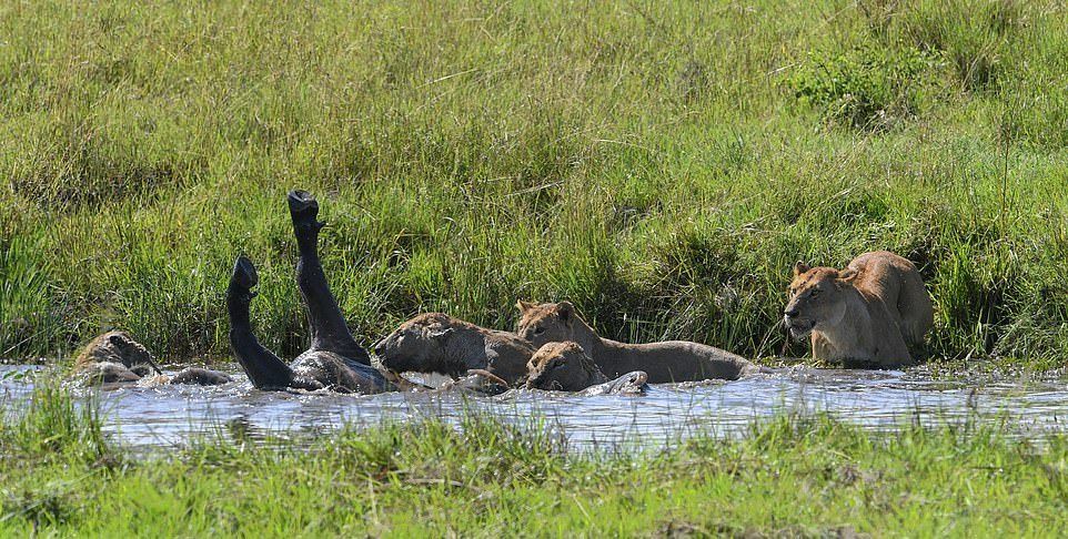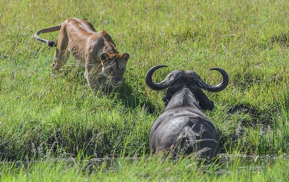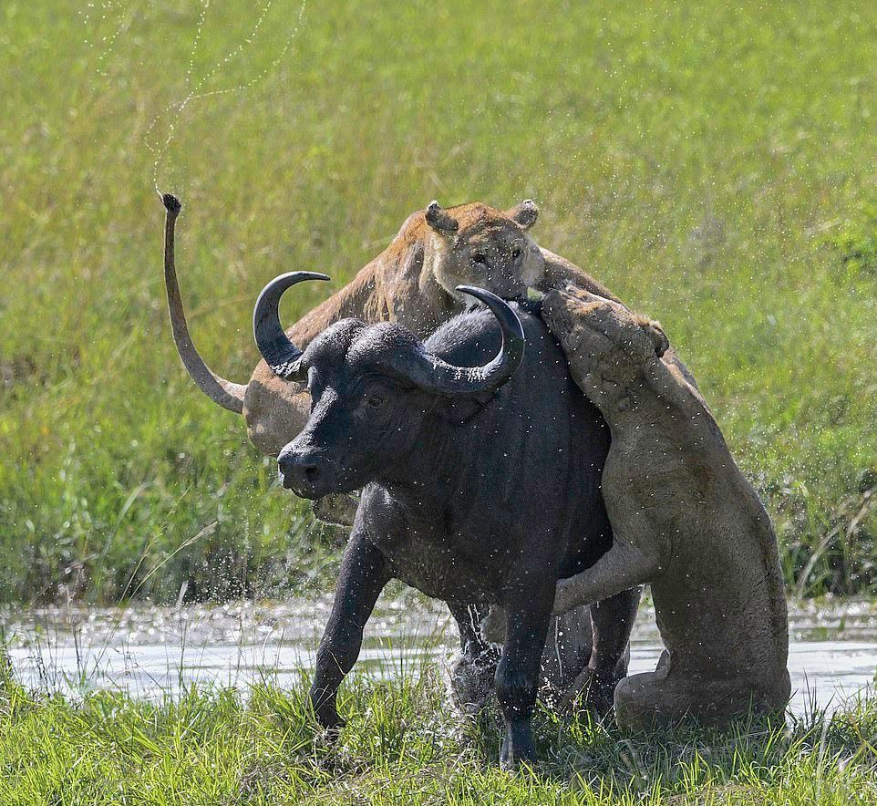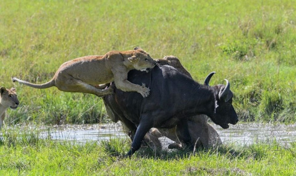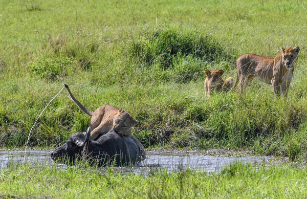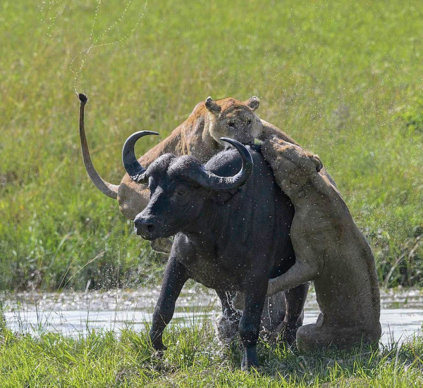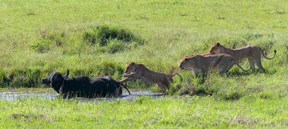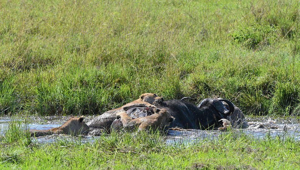 На этих фотографиях запечатлен момент, когда четыре львицы объединились, чтобы утопить буйвола после того, как затащили свою добычу в водопой в Танзании. На снимках изображена львица, подкрадывающаяся к буйволу, который отдыхал среди травы в районе Когатенде на севере Серенгети, Танзания. На другом фото две 400-фунтовые (180 кг) львицы вцепились в спину 1900-фунтового (800 кг) буйвола, толкая свою добычу вниз, погрузив свои когти и зубы в животное.