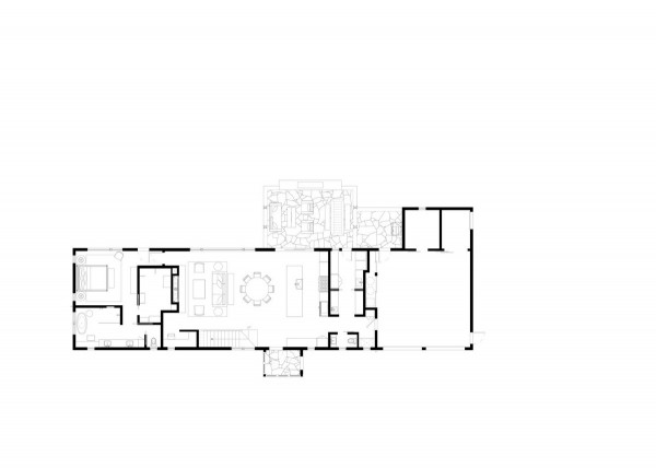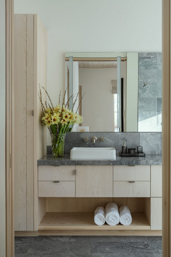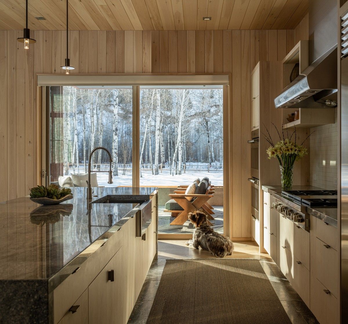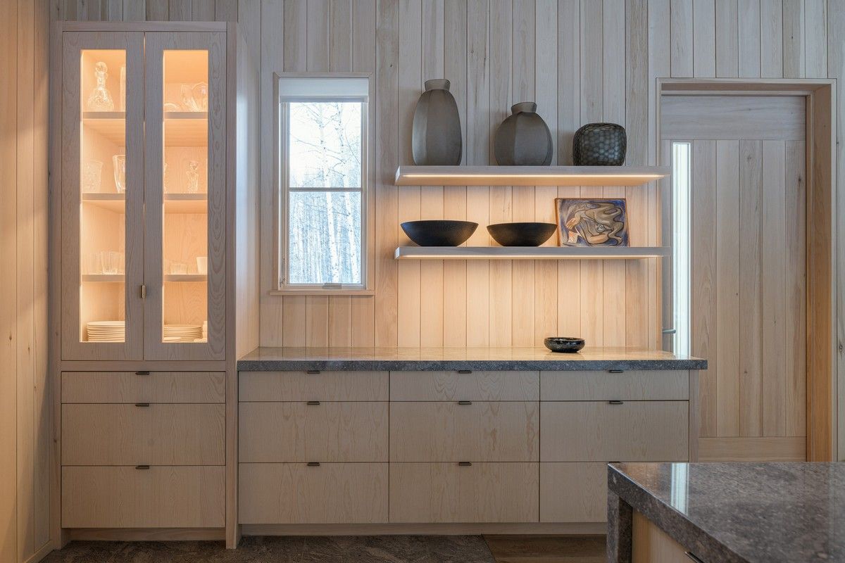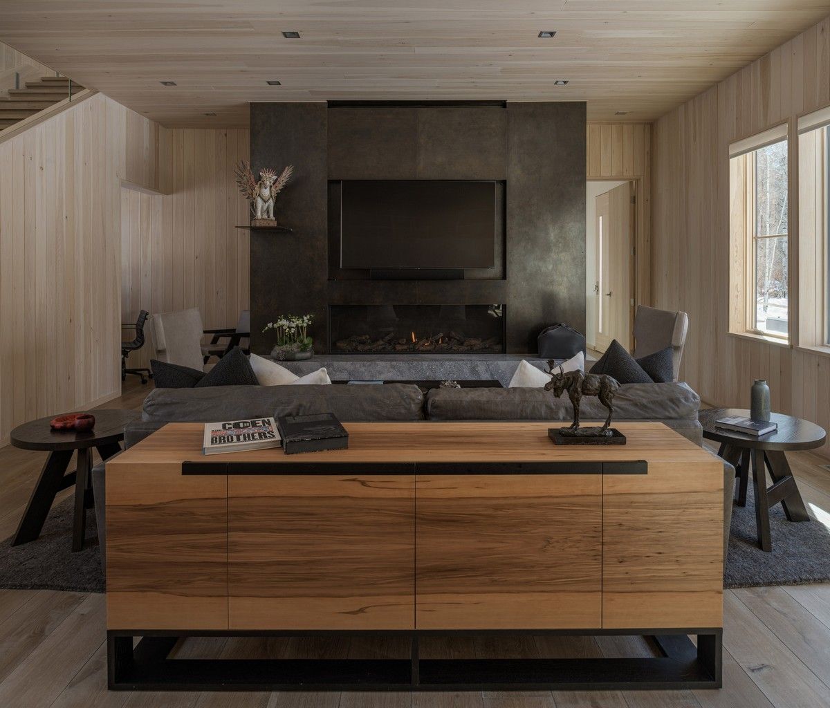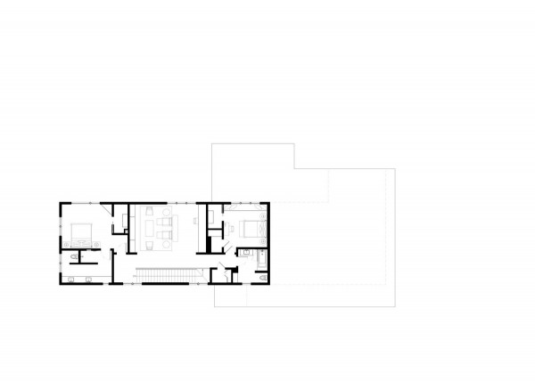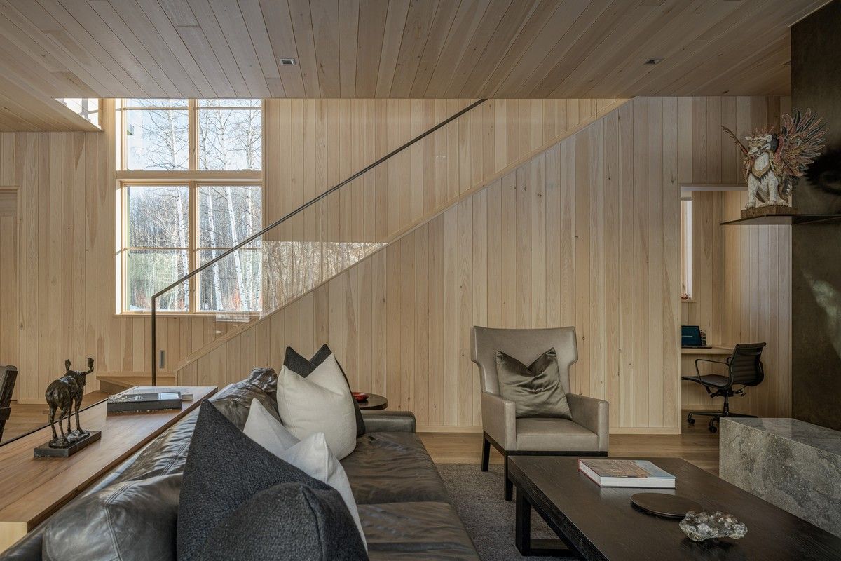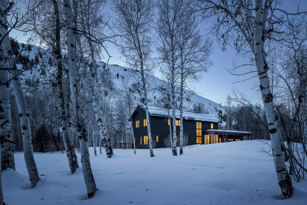 Дом расположен в гармонии с диким прибрежным лесом на берегу реки. Тёмно-серый и чёрный цвета экстерьера дома дополняют осиновый лес. "В проекте представлены темы, которыми известна наша фирма - вставка асимметрии в симметричный план, внимательный выбор и обработка натуральных материалов, а также включение древней эстетики в современный дизайн, - говорят в студии. - Что наиболее важно, этот дизайн отличается простотой, которая противоречит его сложности". Примерно прямоугольный в плане дом состоит из двух прилегающих друг к другу форм - двухэтажного остроконечного объема, напоминающего сарай, и одноэтажного объема с плоской крышей, который намекает на низкие здания ранчо в этом регионе.В остроконечном объекте находятся основные жилые и спальные места, а в нижнем - гараж, кладовая и терраса. Тёмные цвета экстерьера должны гармонировать с окружающими деревьями. Фасады облицованы вертикальным еловым сайдингом, отделанным серо-чёрной морилкой, а фальцевая металлическая крыша цвета графита. Гаражные ворота изготовлены из тёмного анодированного алюминия, а оконные стекла заключены в чёрные алюминиевые рамы. Внутри дома уютные комнаты и плавная планировка.