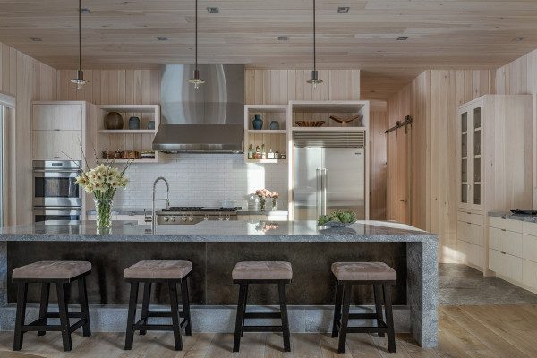 Этот частный особняк, расположенный рядом с рекой Биг-Вуд, сочетает в себе рациональные сельскохозяйственные и современные строительные формы. Двухэтажный двускатный сарай для жилых помещений сочетается с плоской крышей для входа, гаража и террасы. Замысел дизайна - современный амбар снаружи и современная горная хижина внутри.