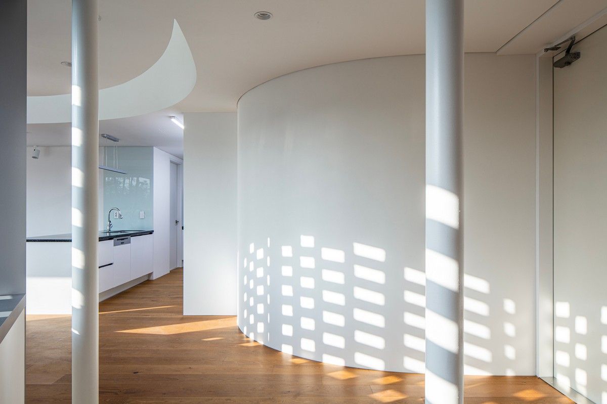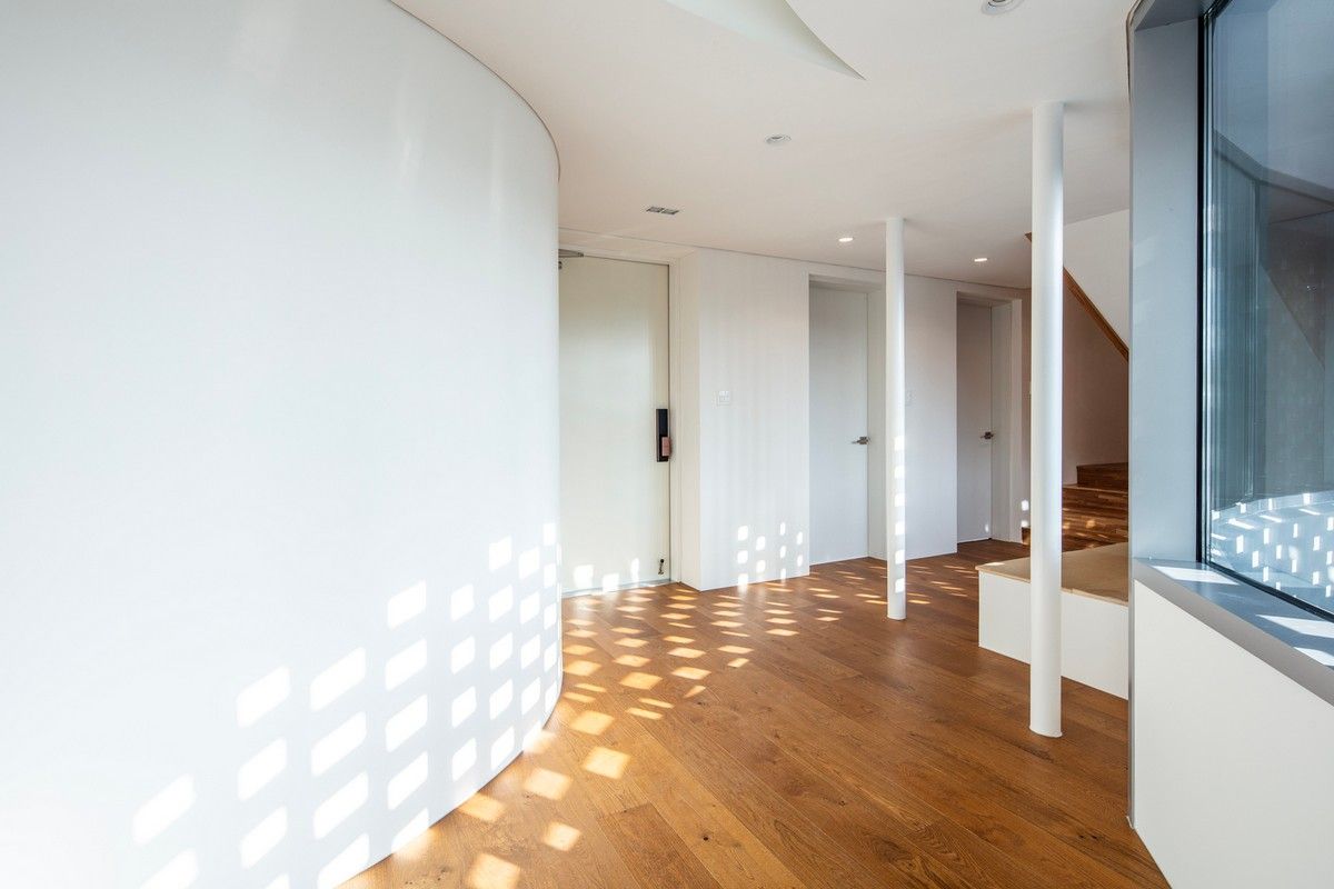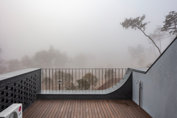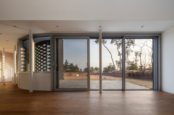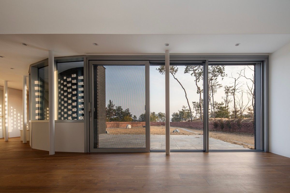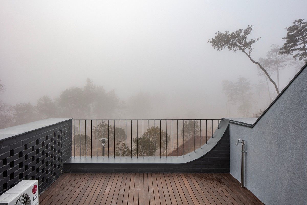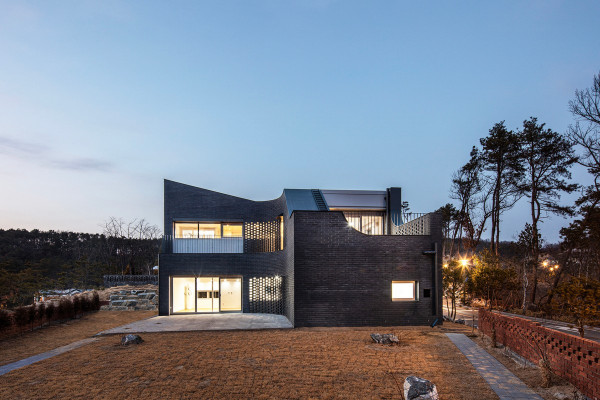 Перед архитекторами стояла задача обеспечить необходимый уровень конфиденциальности, соответствующий потребностям домовладельцев, и, при этом, создать пространства, открытые для сада и панорамных видов на величественные горные хребты Gyeryong.Доминирующим материалом проекта является темный кирпич, который, подобно многослойной ленте, обертывает здание, видоизменяясь в зависимости от программы интерьеров. Приспосабливаясь к функциональному наполнению внутренних пространств, кирпичная лента становится то основательной и тяжелой, то элегантной и тонкой, то сплошной непрозрачной, а то приобретает ажурной вид с просветами, которые формируют рисунок тени-света в интерьере. Со стороны улицы и соседей - это восточный и северный фасады, кирпичные стены практически полностью закрытые, с минимальным количеством небольших окон. Эта часть дома напоминает крепость с высоким уровнем обеспечения конфиденциальности. Постепенно, по мере приближения к саду, стены становятся более пористые и полностью открываются в зеленый двор и на балкон в юго-западном углу здания.Линия крыши фасада со стороны улицы имеет стильный волнистый профиль. Ее высокий подъем блокирует вид с улицы на фотоэлектрические панели, установленные на крыше, при этом, линия крыши на северной стороне опускается до максимально нижней точки, чтобы обеспечить приватность со стороны соседей. Волнистая крыша дома прекрасно смотрится на фоне горных хребтов, повторяя конфигурацию ее природных изгибов.Важную роль в решении ряда проблем, возникающих в процессе проектирования, сыграло применение в проекте планиметрических кривых. Заказчику требовалась конкретная планировка дома с наличием определенного количества функциональных пространств, однако в рамках установленного бюджета это было осуществить затруднительно. Чтобы создать желаемую планировку, архитекторы решили использовать дугообразные стены и изогнутые коридоры, которые бы соединили пространства с достаточным зазором. Плавное движение изогнутых коридоров позволило расширить проем между этажами и создать естественную вертикальную циркуляцию воздуха. Дугообразная внешняя стена вдоль длинной и узкой подпорной стены с северной стороны здания создает больше пространства для циркуляции и освещения в служебной зоне, в то время как дуга кирпичной стены на южной стороне выполняет защитную роль, спасая от яркого солнца и дождя.Двухэтажный дом площадью 192 квадратных метров имеет четкое распределений функциональных пространств. Нижний этаж занимает социальная зона открытого плана, которая объединяет гостиную, столовую и кухню. Кроме того, на первом этаже также находятся гостевая комната и гараж на два автомобиля. На втором этаже располагается приватная зона с 4 спальнями, ванной комнатой, гардеробной и двумя балконами.
