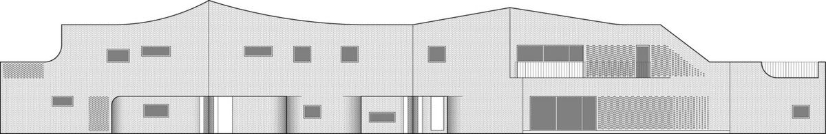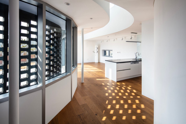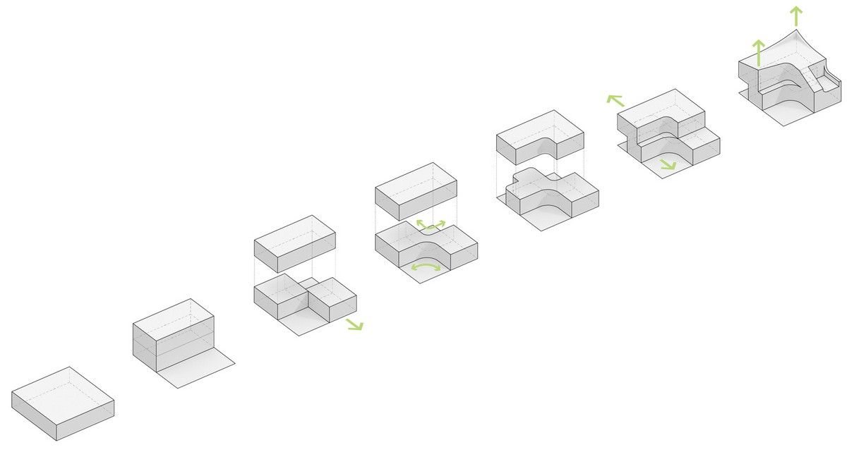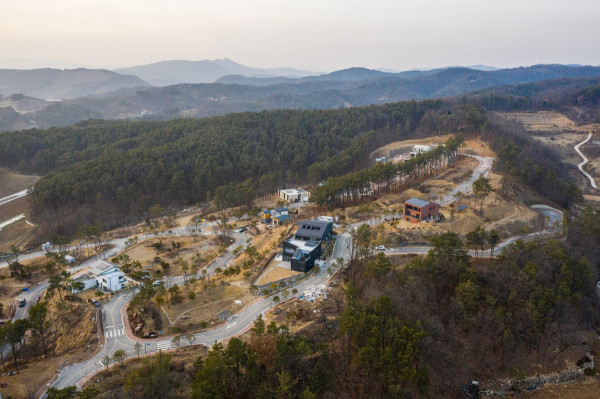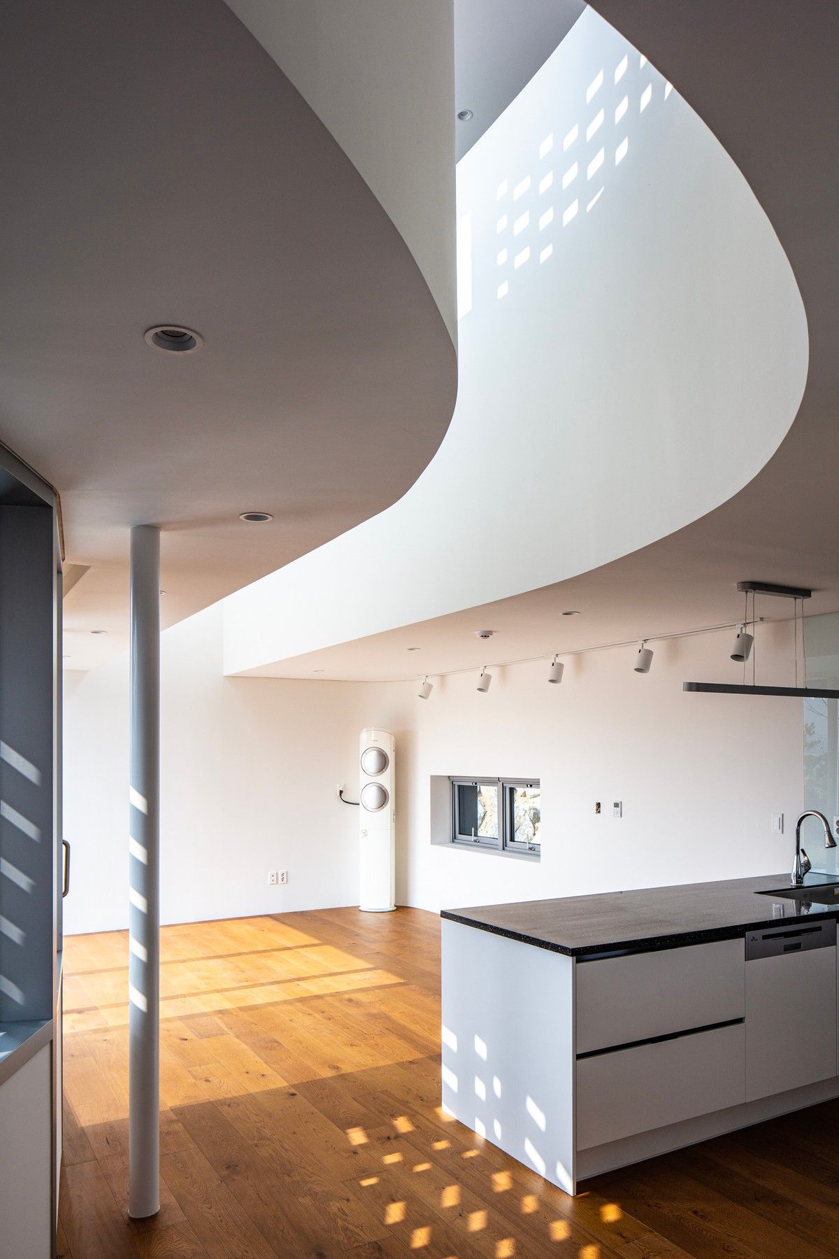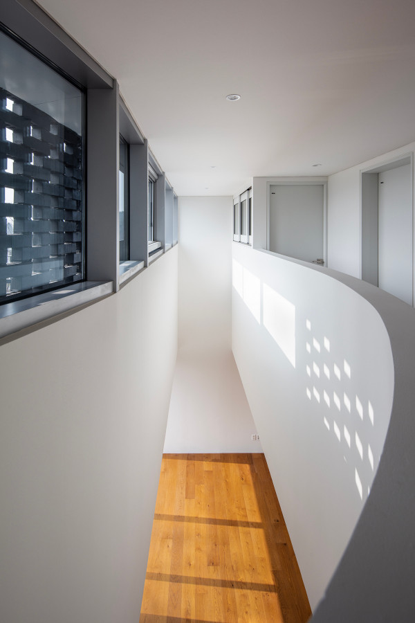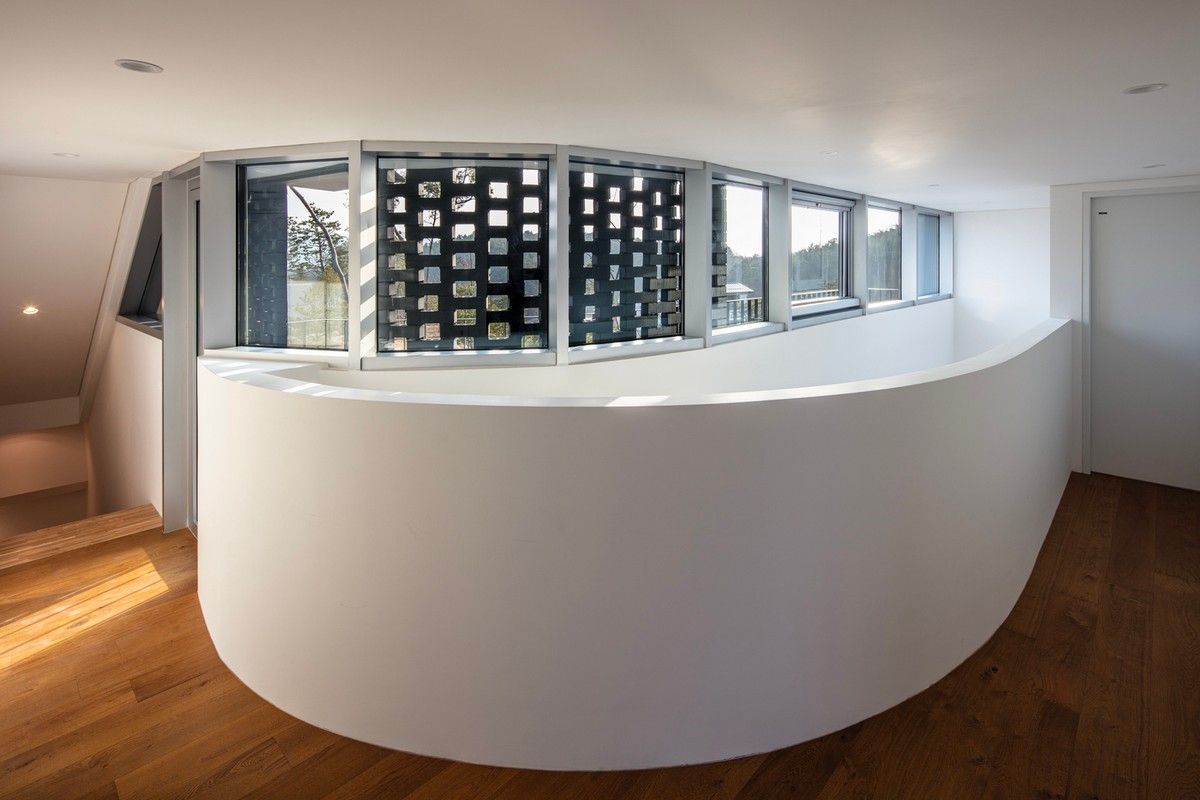 Перед архитекторами стояла задача обеспечить необходимый уровень конфиденциальности, соответствующий потребностям домовладельцев, и, при этом, создать пространства, открытые для сада и панорамных видов на величественные горные хребты Gyeryong.Доминирующим материалом проекта является темный кирпич, который, подобно многослойной ленте, обертывает здание, видоизменяясь в зависимости от программы интерьеров. Приспосабливаясь к функциональному наполнению внутренних пространств, кирпичная лента становится то основательной и тяжелой, то элегантной и тонкой, то сплошной непрозрачной, а то приобретает ажурной вид с просветами, которые формируют рисунок тени-света в интерьере. Со стороны улицы и соседей - это восточный и северный фасады, кирпичные стены практически полностью закрытые, с минимальным количеством небольших окон. Эта часть дома напоминает крепость с высоким уровнем обеспечения конфиденциальности. Постепенно, по мере приближения к саду, стены становятся более пористые и полностью открываются в зеленый двор и на балкон в юго-западном углу здания.Линия крыши фасада со стороны улицы имеет стильный волнистый профиль. Ее высокий подъем блокирует вид с улицы на фотоэлектрические панели, установленные на крыше, при этом, линия крыши на северной стороне опускается до максимально нижней точки, чтобы обеспечить приватность со стороны соседей. Волнистая крыша дома прекрасно смотрится на фоне горных хребтов, повторяя конфигурацию ее природных изгибов.Важную роль в решении ряда проблем, возникающих в процессе проектирования, сыграло применение в проекте планиметрических кривых. Заказчику требовалась конкретная планировка дома с наличием определенного количества функциональных пространств, однако в рамках установленного бюджета это было осуществить затруднительно. Чтобы создать желаемую планировку, архитекторы решили использовать дугообразные стены и изогнутые коридоры, которые бы соединили пространства с достаточным зазором. Плавное движение изогнутых коридоров позволило расширить проем между этажами и создать естественную вертикальную циркуляцию воздуха. Дугообразная внешняя стена вдоль длинной и узкой подпорной стены с северной стороны здания создает больше пространства для циркуляции и освещения в служебной зоне, в то время как дуга кирпичной стены на южной стороне выполняет защитную роль, спасая от яркого солнца и дождя.Двухэтажный дом площадью 192 квадратных метров имеет четкое распределений функциональных пространств. Нижний этаж занимает социальная зона открытого плана, которая объединяет гостиную, столовую и кухню. Кроме того, на первом этаже также находятся гостевая комната и гараж на два автомобиля. На втором этаже располагается приватная зона с 4 спальнями, ванной комнатой, гардеробной и двумя балконами.
