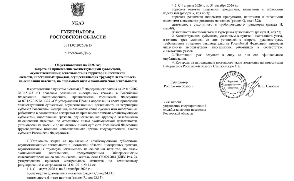 В Ростовской области с 1 апреля трудовые мигранты не смогут работать курьерами и продавцами продуктов, напитков и табака как в розничной, так и оптовой торговле, следует из указа губернатора региона Юрия Слюсаря. Кроме того, приезжим запретят трудиться на трубопроводах, водителями наземного транспорта (включая поезда), а также сотрудниками фитнес-центров и почтовой связи. Отмечается, что ограничения будут действовать до 31 декабря нынешнего года. Вероятно, власти смогут продлить ограничения в дальнейшем, если она подтвердят эффективность и необходимость.СМИ отмечают, что в настоящий момент в Ростовской области работают около 400 000 самозанятых курьеров, однако доля приезжих в них ниже, чем в двух столицах.