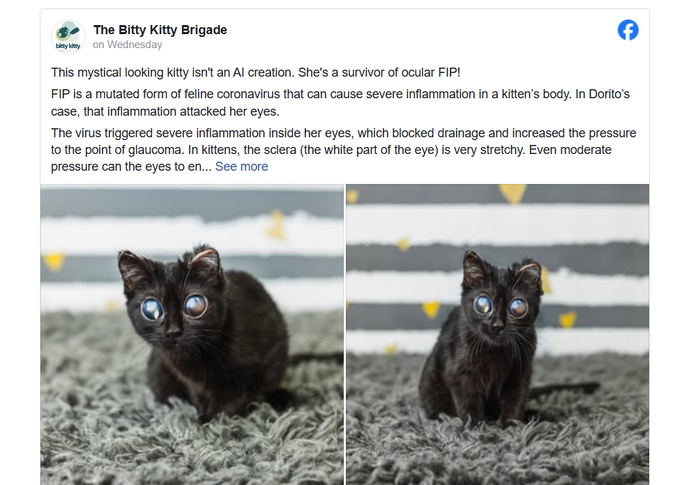 Дорито назначили курс агрессивных противовирусных препаратов по самым современным протоколам. Спецы буквально вытащили животное с того света. Давление удалось стабилизировать, язвы зажили, а инфекция окончательно капитулировала.Сейчас Дорито официально здорова и даже нашла постоянный дом. Единственный нюанс заключается в том, что ее глаза так и остались огромными. Теперь котенок напоминает инопланетного гостя и требует особого ухода. Из за размеров век глаза не закрываются полностью, поэтому хозяевам приходится регулярно использовать специальные капли.
