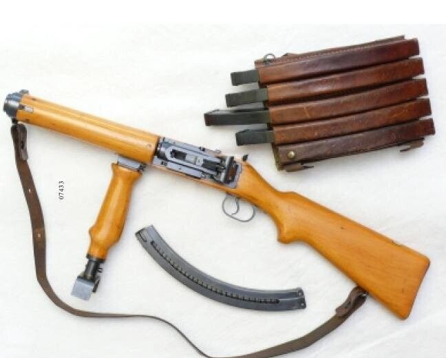 Технические характеристикиДлина общая 790 ммВес б/п 4,8 кгПатрон 7,65х21 ЛюгерДальность до 150 мСкорострельность до 1.200 в/мЕмкость магазина 40 патронов