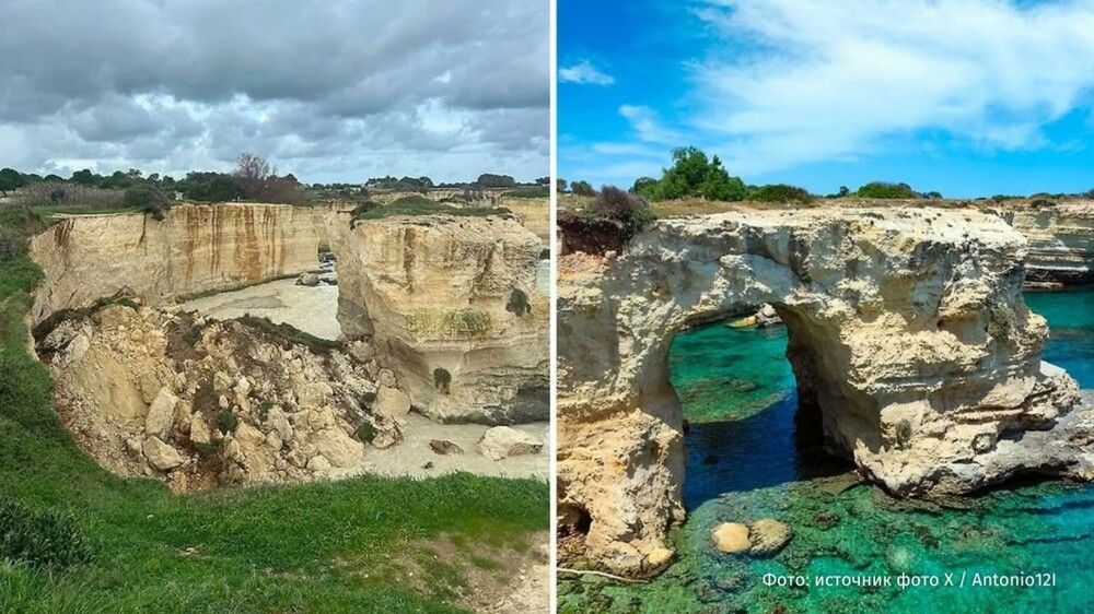 В итальянской области Апулия из-за разгула стихии обрушилась скала, известная как "Арка влюбленных". Природная достопримечательность на побережье Адриатического моря не выдержала удара непогоды. Инцидент произошел 14 февраля, в День всех влюбленных.