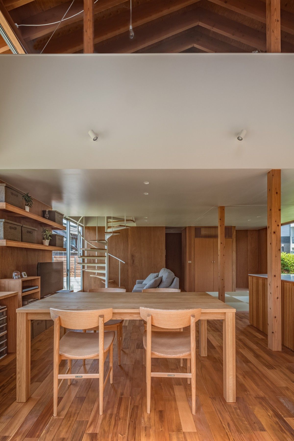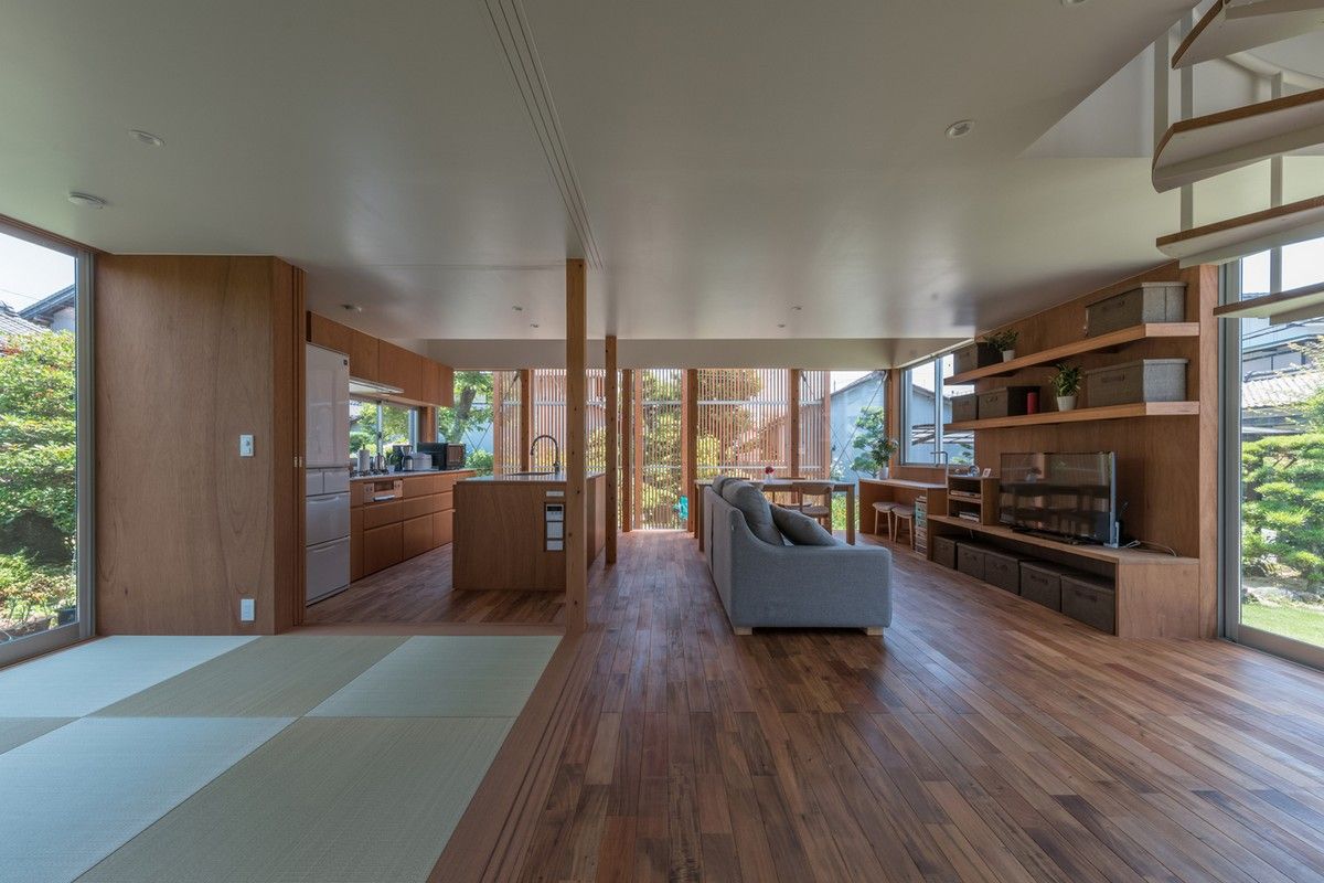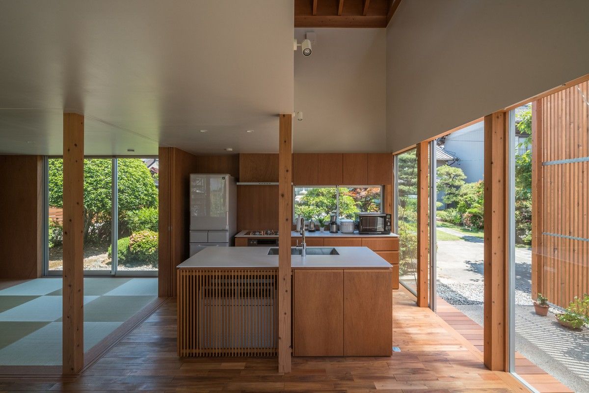 Проект House in Otai, разработанный архитектурным бюро Mizuishi Architect Atelier и реализованный в 2017 году в городе Киёсу, префектуры Айти, Япония, представляет собой строительство двухэтажного дома для молодой семьи. Участок, находящийся среди тихих сельскохозяйственных угодий, многие годы принадлежит одной семье и передается по наследству. В настоящее время в нем проживает два поколения. В северной части большого участка находится дом родителей, а с южной стороны - дом семьи их сына, его жены и маленькой дочери. Между домами находится северный сад, выполняющий роль связующего звена. Цель проекта заключалась в создании уютного жилья для молодой семьи и установлении естественных отношений между двумя домами с сохранением необходимой конфиденциальности и, в то же время, ощущением единого семейного пространства.