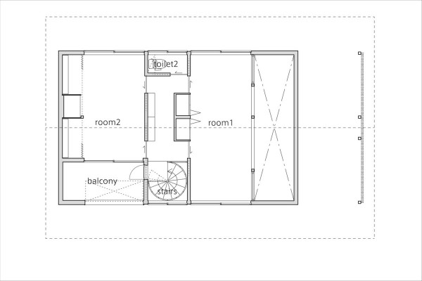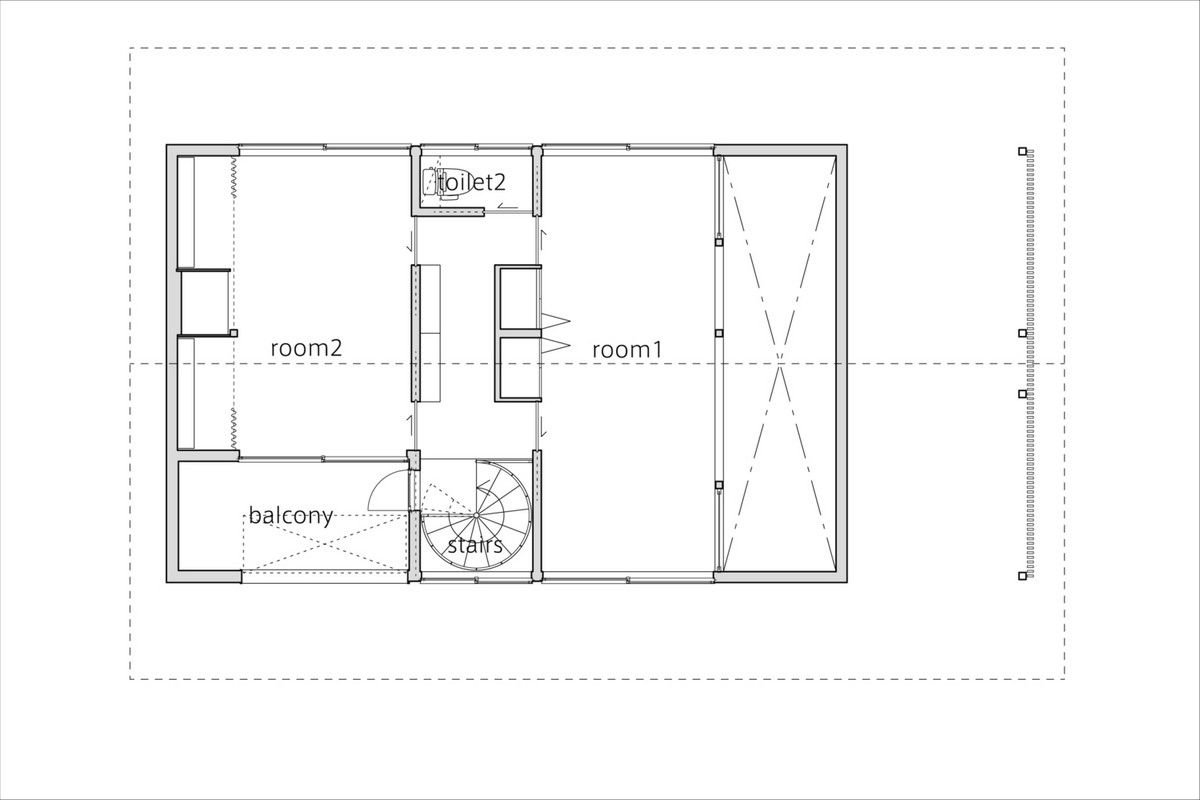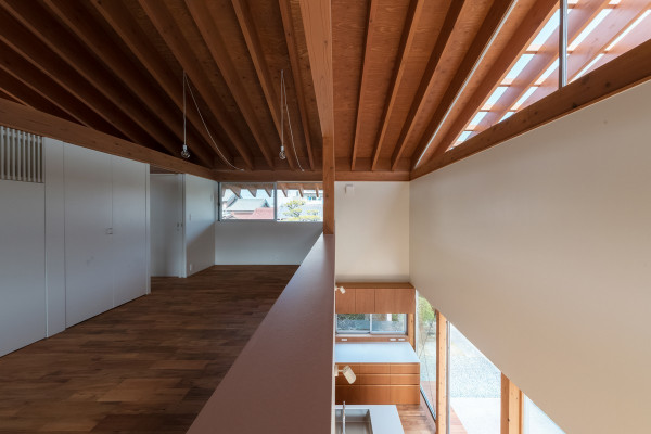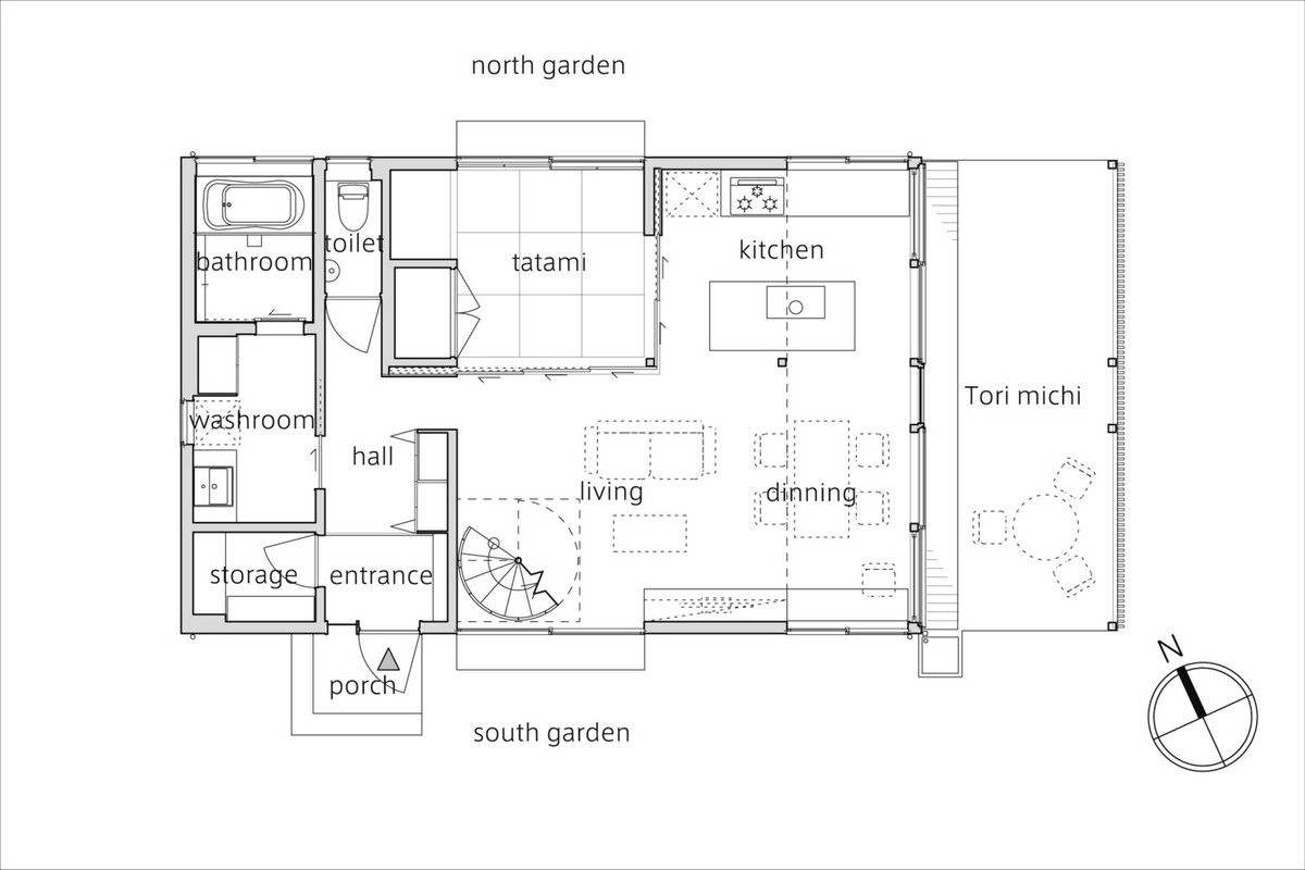 Реализуя проект, архитекторы сохранили роскошный садовый ландшафт между двумя домами, и соединили социальную зону нового дома с ее естественным внешним окружением. Двухэтажный белый объем площадью 108 квадратных метров был покрыт двускатной деревянной крышей, проницаемая часть которой образует с восточной стороны здания новое пространство двойной высоты под названием "Тори-мичи". Светопроницаемая деревянная кровля и поддерживающая ее стена, выполненная из деревянных жалюзи, защищают это место от яркого солнечного света и ветра. Полуоткрытое пространство с прозрачным потолком, через который проникает естественный свет, также может использоваться родителями владельца и является прекрасным местом для отдыха всей семьи на свежем воздухе. Широкие карнизы выступают с северного и южного фасадов и соединяются с западной стороны.Основные жилые помещения дома находятся на первом этаже - гостиная, столовая, кухня, а также комната с татами и прачечная. Верхний этаж с открытыми стропилами и балками на наклонной деревянной крышей занимают две спальни с видом на прилегающий сад.