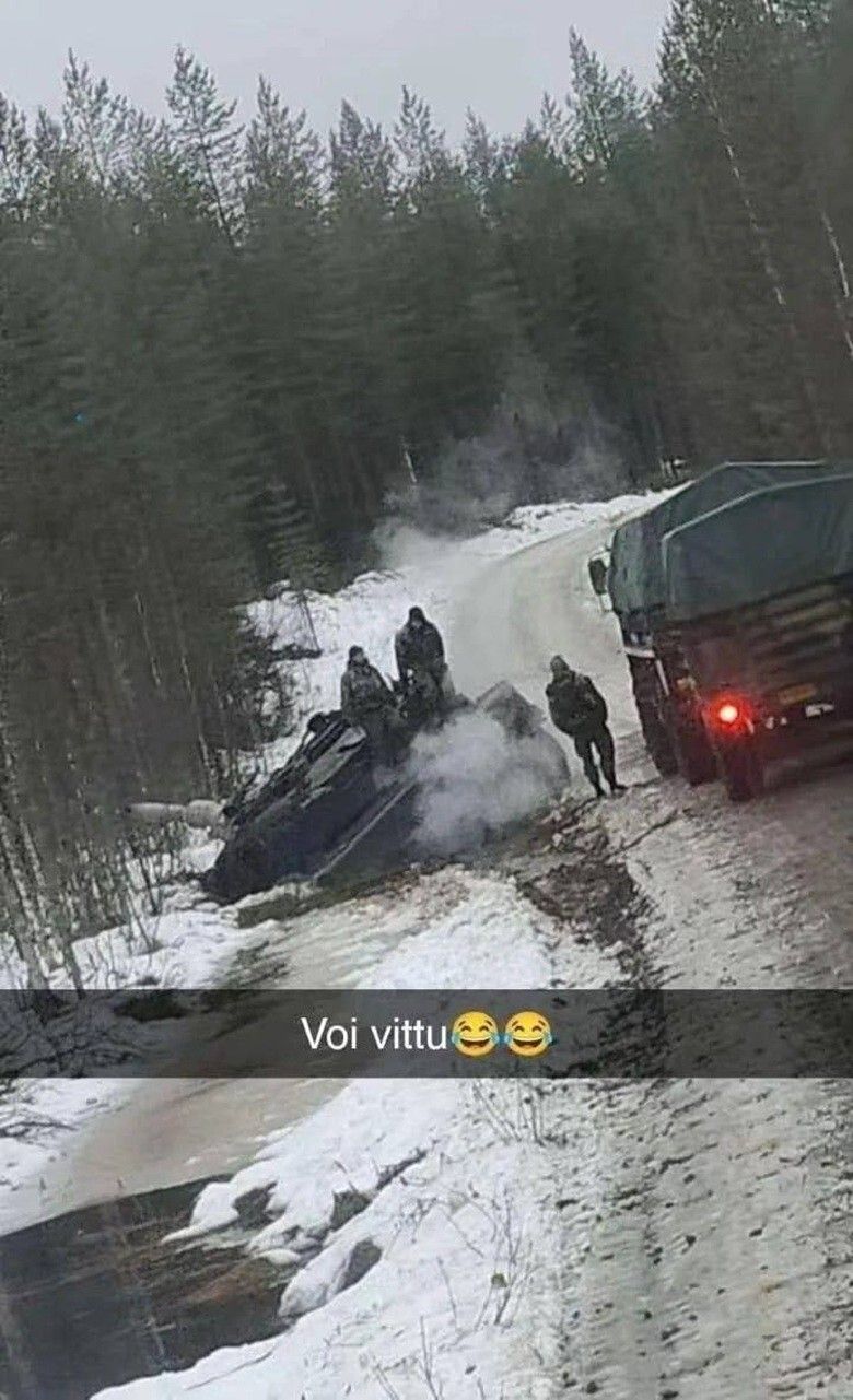 Leopard 2A4 (гордость Бундесвера на финской службе) решил внепланово прилечь отдохнуть в придорожной канаве. Видимо, финские танкисты настолько усердно вглядывались в горизонт в поисках "угроз", что просмотрели обычный съезд с дороги. В итоге многотонная махина нелепо завалилась в кювет, намертво застряв в снежной каше и грязи.