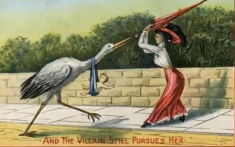 Карикатура, изображающая женщину, которая зонтиком отгоняет аиста, несущего ей новорождённого ребёнка. Подпись гласит: "А злодей всё преследует её".