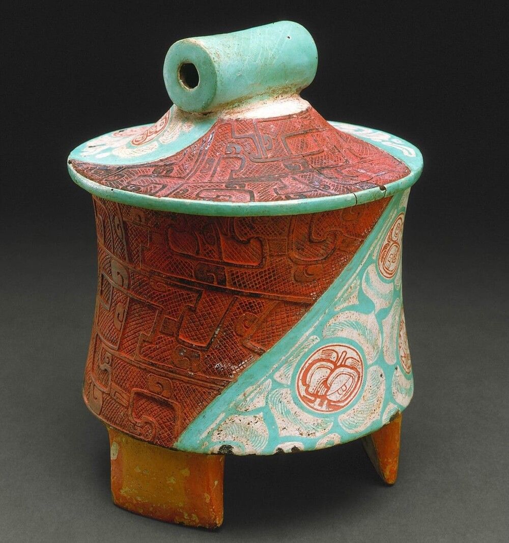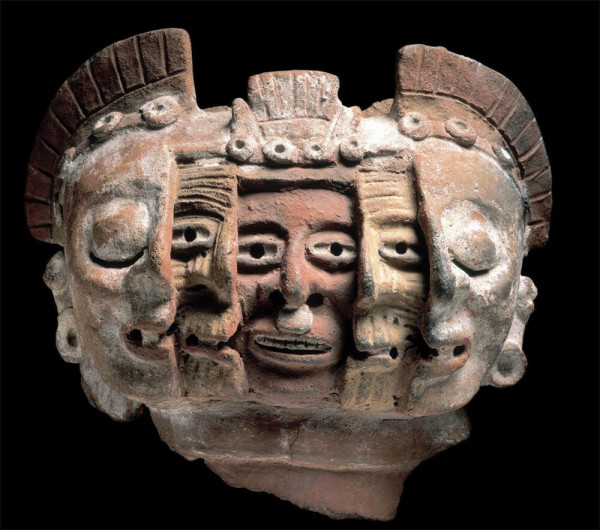 Беззубый старик, изображённый двумя половинками, заключает в себе молодого человека в центре. Разделённое лицо покойника обрамляет их обоих. Вероятно, ацтекская работа, около 1300 года н.э.