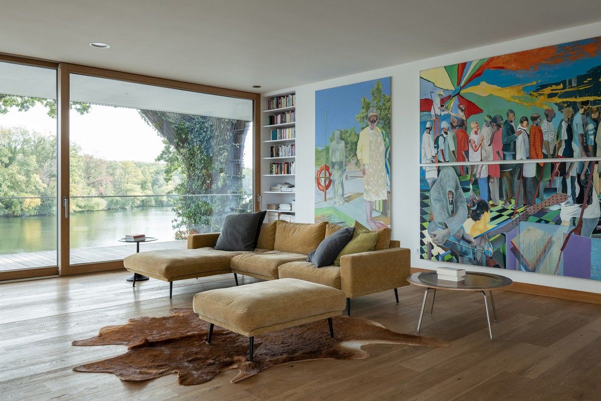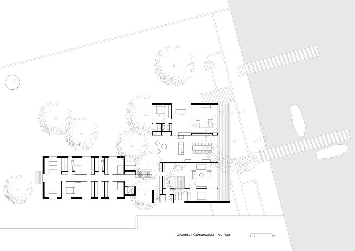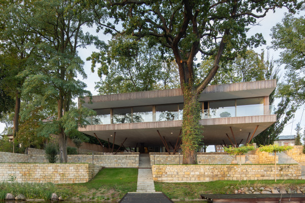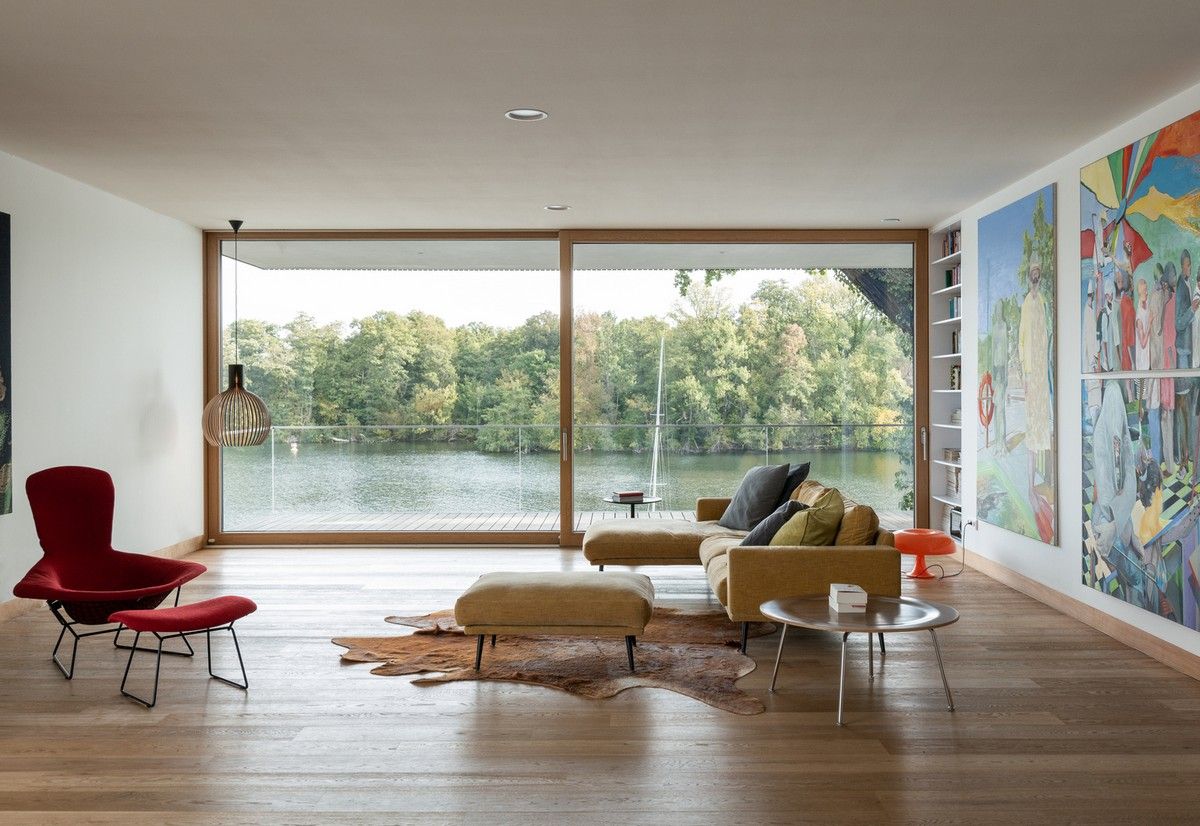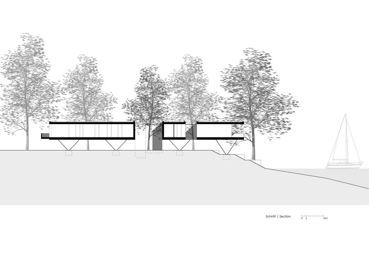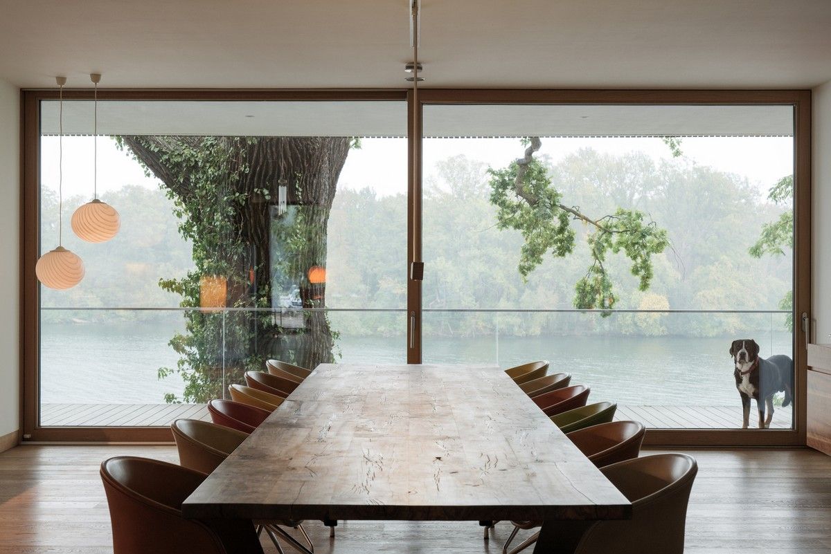 Берлинский архитектор Карлос Цвик (Carlos Zwick), влюбившийся в это идиллическое место и заросшее здание, в 2014 году купил его с мечтой о строительстве здесь большого семейного дома. Приобретая участок с полуразрушенными постройками, Карлос Цвик не знал, сможет ли он получить разрешение на его строительство. Но, несмотря на это, он приступил к работе над проектом, источником вдохновения для которого стал Дом Фарнсуорт (Стеклянный дом) в США, построенный по проекту архитектора Людвига Мис ван дер Роэ в 1951 году.Для утверждения плана застройки потребовалось оформить пять заявок. Окончательный вариант предполагал обновление первоначальных конструкций и полное сохранение и реставрацию террас, которые были известны как императорские, поскольку в прошлом император, действительно, любил пить здесь кофе и любоваться пейзажной картинкой озера. Карлос Цвик бережно отнесся к историческому наследию и постарался также максимально сохранить целостность участка и растущие на нем вековые деревья.Дом площадью 712 квадратных метров разделен на два объема - главный дом и пристройку, расположенную к нему под прямым углом. Здание стоит на 40 диагональных железных сваях, которые приподнимают его на высоту трех метров над землей, открывая панорамный вид на озеро и предоставляя возможность сохранить существующие деревья. Старый клен, оказавшийся на площадке, также был сохранен и теперь растет посреди гостиной. Императорские террасы уважительно поддерживаются десятью отдельными фундаментами.Экологический баланс объекта и природного ландшафта обеспечивается натуральными строительными материалами и солнечной тепловой системой, установленной на крыше. Фасады дома облицованы вертикальными деревянными рейками из лиственницы, что позволяет строению легко интегрироваться в кроны вековых дубов и каштанов. Реализация проекта сопровождалась возникновением определенных трудностей, связанных с расположением участка. Густые деревья и близость воды не позволяли использовать серьезную технику, поэтому все работы по возведению здания велись только с помощью мобильного телескопического погрузчика.Главный фасад длиной 22 метра обращен к озеру, а по всей его длине на высоте восьми метров над уровнем воды простирается терраса со стеклянным ограждением, создавая ощущение парения прямо над озером. Появляющиеся на озере лебеди и цапли, а вечерами выползающие на мелководье выдры, оказываются на уровне глаз отдыхающих на террасе, что делает отдых особенно впечатляющим. Три отдельные жилые зоны через раздвижные стеклянные двери связаны с террасой и имеют беспрепятственный вид на озеро.Центр дома занимает социальная зона открытого плана - гостиная и столовая-кухня. В центре столовой установлен стол из оливкового дерева длиной 7,5 метров. Большой камин в гостиной привносит ощущение домашнего уюта. Украшением интерьера являются современные картины, в некоторых помещениях они занимают всю 3-х метровую высоту стены.