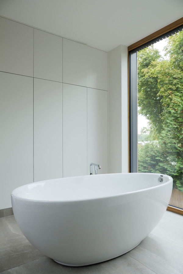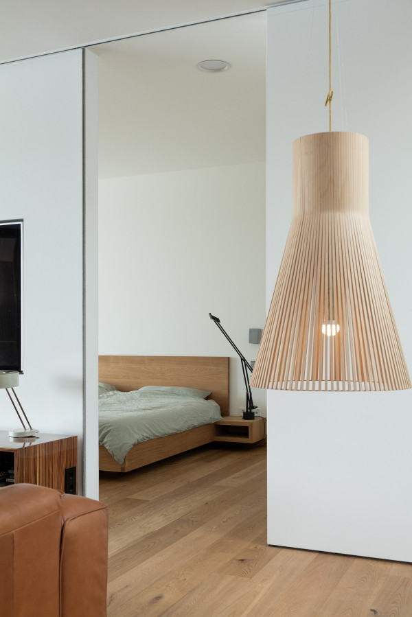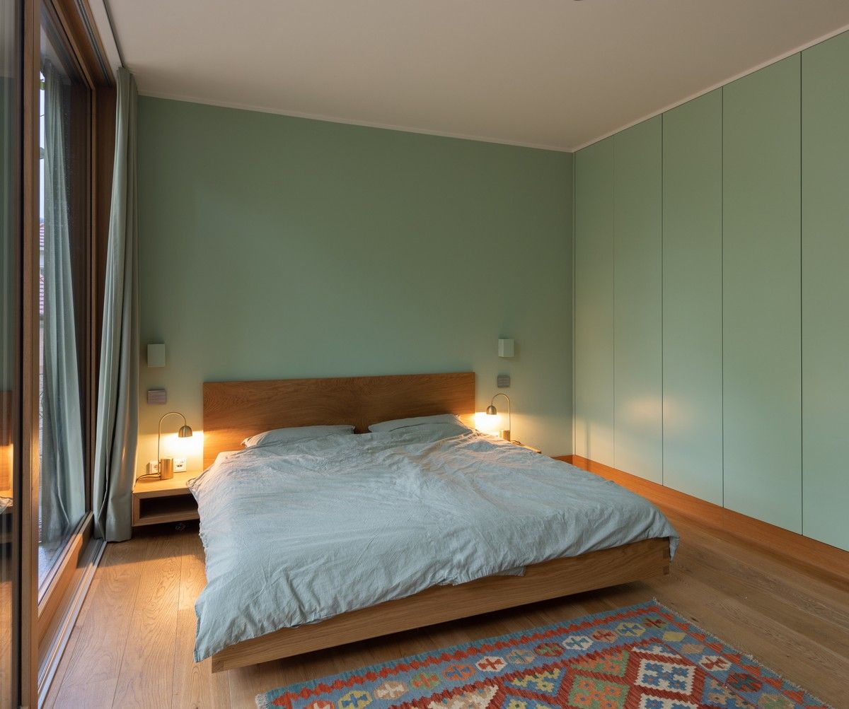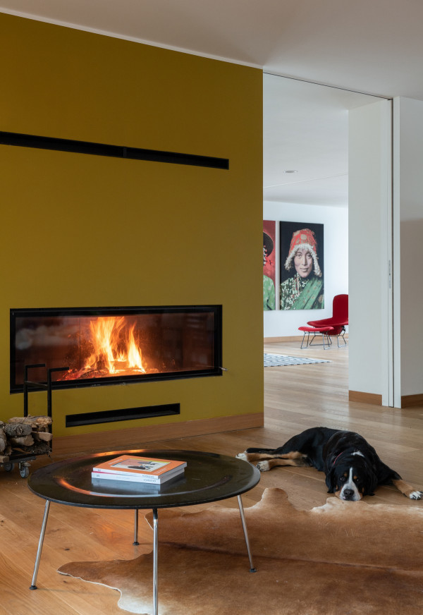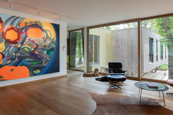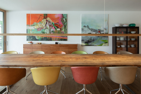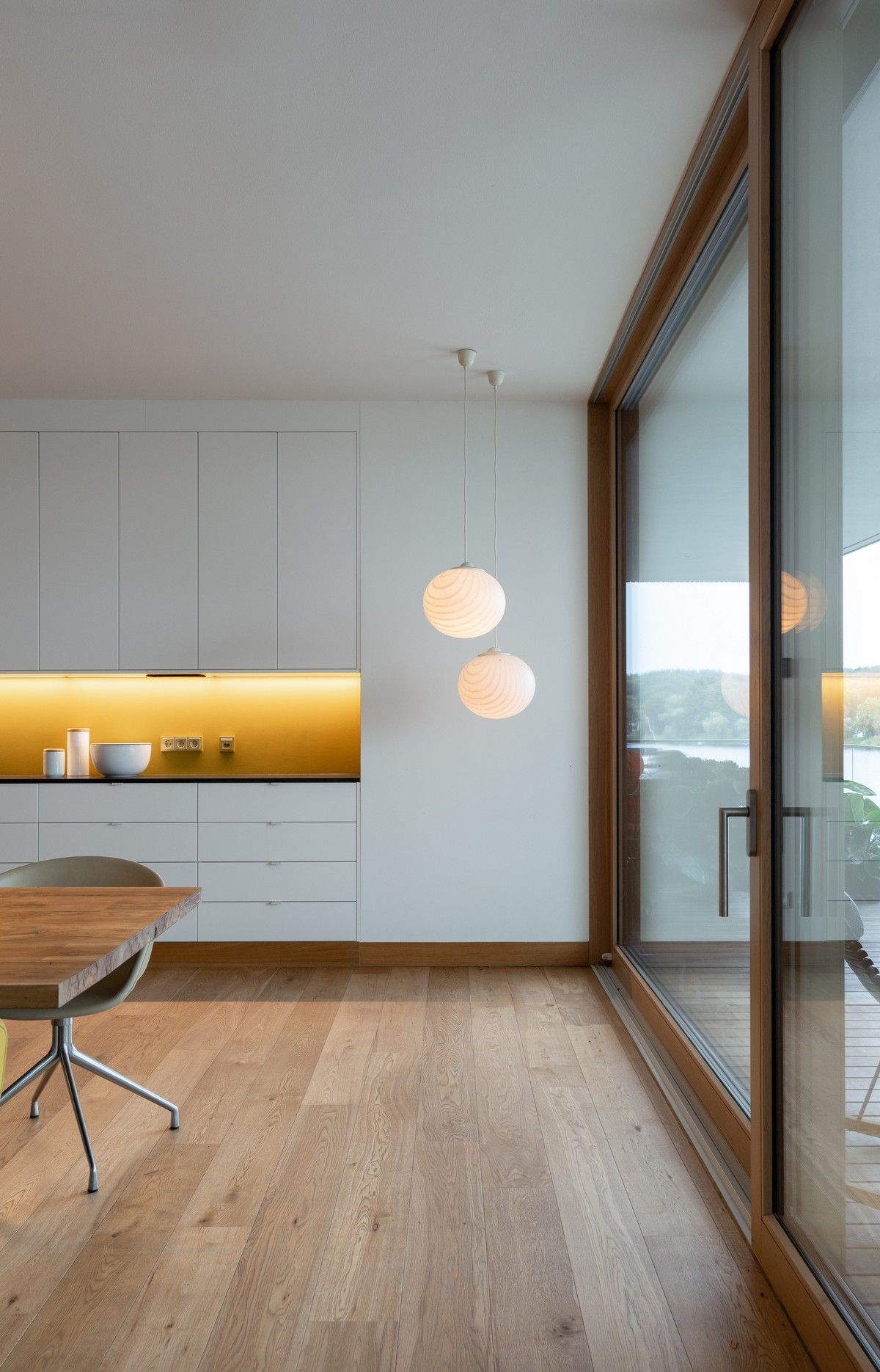 Берлинский архитектор Карлос Цвик (Carlos Zwick), влюбившийся в это идиллическое место и заросшее здание, в 2014 году купил его с мечтой о строительстве здесь большого семейного дома. Приобретая участок с полуразрушенными постройками, Карлос Цвик не знал, сможет ли он получить разрешение на его строительство. Но, несмотря на это, он приступил к работе над проектом, источником вдохновения для которого стал Дом Фарнсуорт (Стеклянный дом) в США, построенный по проекту архитектора Людвига Мис ван дер Роэ в 1951 году.Для утверждения плана застройки потребовалось оформить пять заявок. Окончательный вариант предполагал обновление первоначальных конструкций и полное сохранение и реставрацию террас, которые были известны как императорские, поскольку в прошлом император, действительно, любил пить здесь кофе и любоваться пейзажной картинкой озера. Карлос Цвик бережно отнесся к историческому наследию и постарался также максимально сохранить целостность участка и растущие на нем вековые деревья.Дом площадью 712 квадратных метров разделен на два объема - главный дом и пристройку, расположенную к нему под прямым углом. Здание стоит на 40 диагональных железных сваях, которые приподнимают его на высоту трех метров над землей, открывая панорамный вид на озеро и предоставляя возможность сохранить существующие деревья. Старый клен, оказавшийся на площадке, также был сохранен и теперь растет посреди гостиной. Императорские террасы уважительно поддерживаются десятью отдельными фундаментами.Экологический баланс объекта и природного ландшафта обеспечивается натуральными строительными материалами и солнечной тепловой системой, установленной на крыше. Фасады дома облицованы вертикальными деревянными рейками из лиственницы, что позволяет строению легко интегрироваться в кроны вековых дубов и каштанов. Реализация проекта сопровождалась возникновением определенных трудностей, связанных с расположением участка. Густые деревья и близость воды не позволяли использовать серьезную технику, поэтому все работы по возведению здания велись только с помощью мобильного телескопического погрузчика.Главный фасад длиной 22 метра обращен к озеру, а по всей его длине на высоте восьми метров над уровнем воды простирается терраса со стеклянным ограждением, создавая ощущение парения прямо над озером. Появляющиеся на озере лебеди и цапли, а вечерами выползающие на мелководье выдры, оказываются на уровне глаз отдыхающих на террасе, что делает отдых особенно впечатляющим. Три отдельные жилые зоны через раздвижные стеклянные двери связаны с террасой и имеют беспрепятственный вид на озеро.Центр дома занимает социальная зона открытого плана - гостиная и столовая-кухня. В центре столовой установлен стол из оливкового дерева длиной 7,5 метров. Большой камин в гостиной привносит ощущение домашнего уюта. Украшением интерьера являются современные картины, в некоторых помещениях они занимают всю 3-х метровую высоту стены.