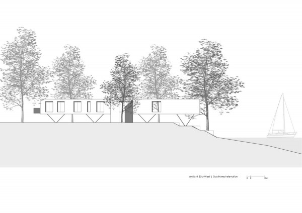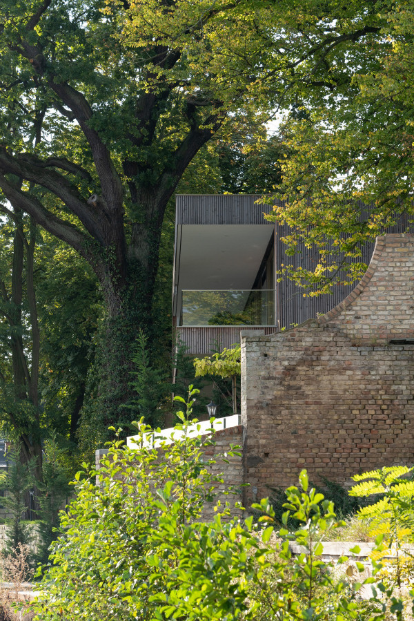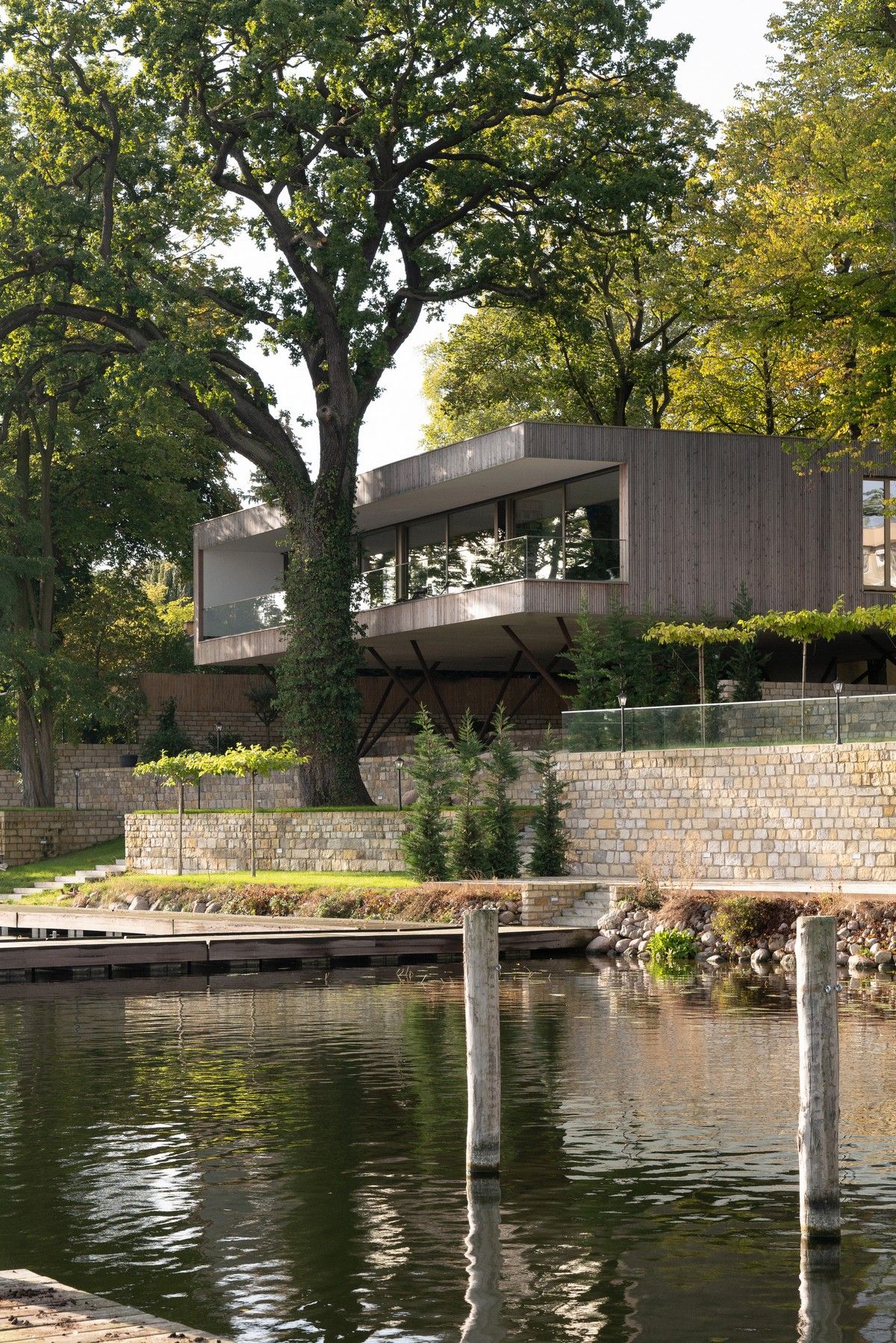 Проект "Дом у озера" (House by the Lake), разработанный архитектурной фирмой Carlos Zwick Architekten BDA, реализован в 2020 году на берегу озера Юнгфернзе, в парковой зоне города Потсдам, Германия. Когда-то эти места были популярным местом отдыха горожан и туристов. Здесь стояло кафе, и тысячи людей отдыхали на берегу живописного озера, наслаждаясь домашним мороженым и лимонадом. На берегу стоял причал для частных лодок и паромов, здесь был даже бальный зал. Со временем все постройки на территории усадьбы обветшали и пришли в негодность. Несмотря на близкое расположение к центру города и красивые пейзажные виды, покупателя на эти полуразрушенные объекты не находилось. Причина была еще и в особенностях места - строения, расположенные в историческом парке, охранялись законом, а строительство новых объектов в пределах 50 метров от берега запрещалось.