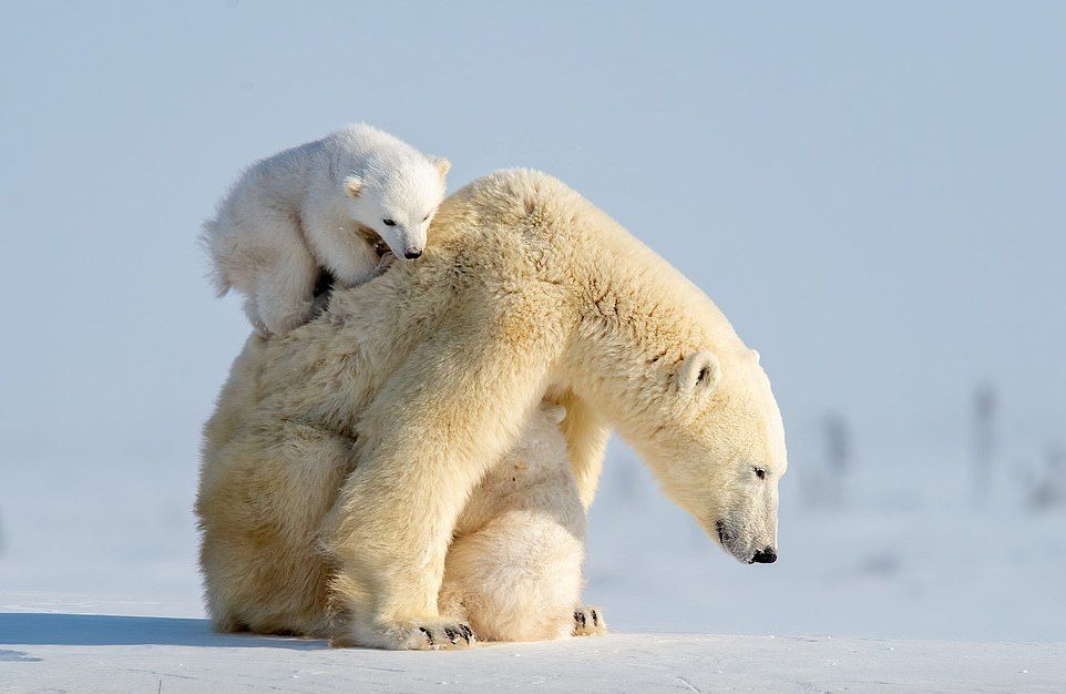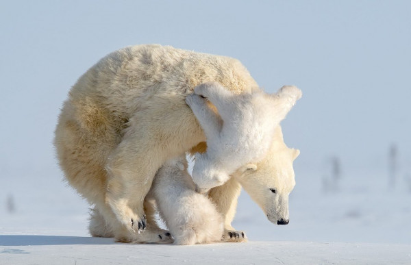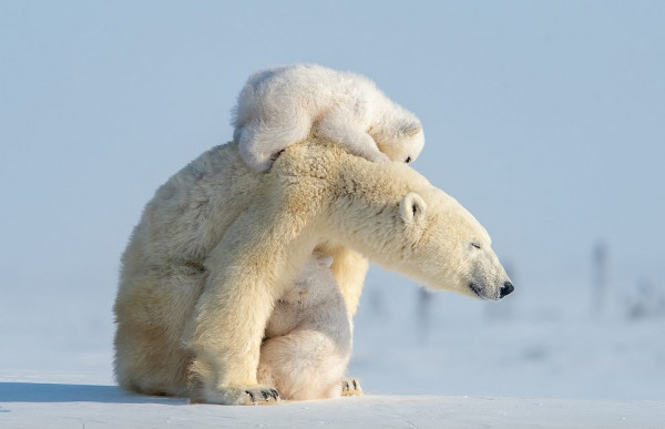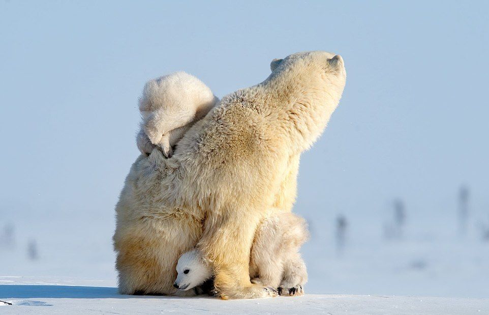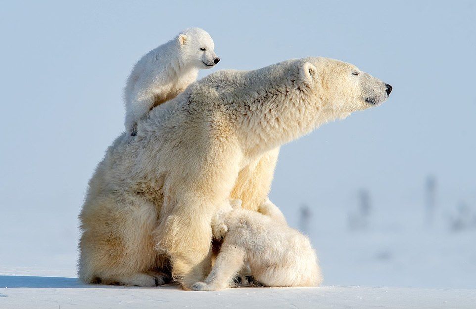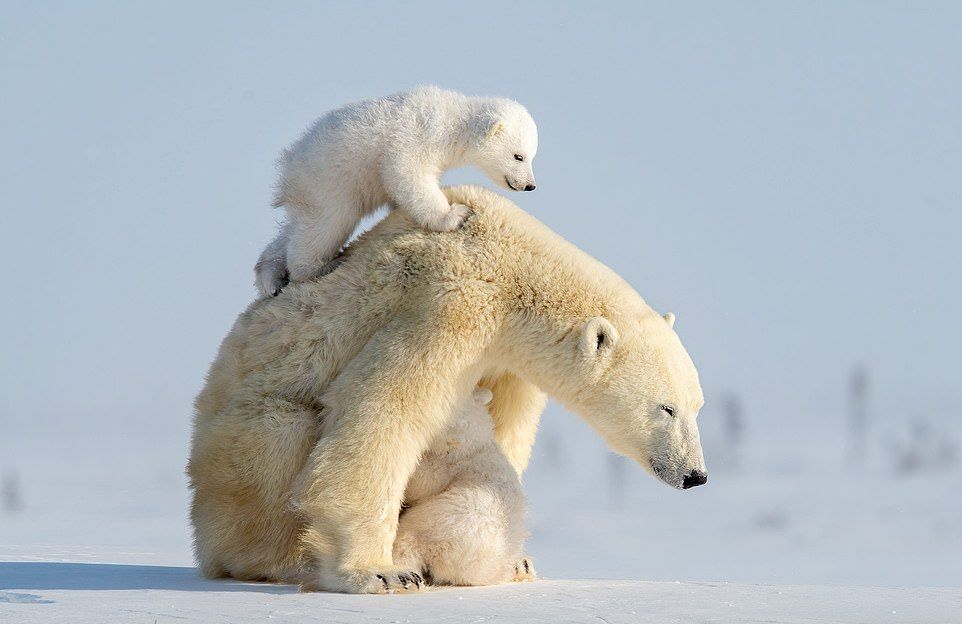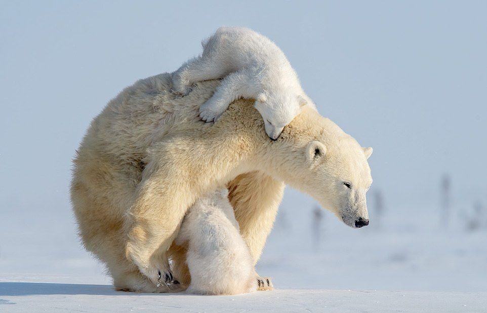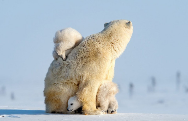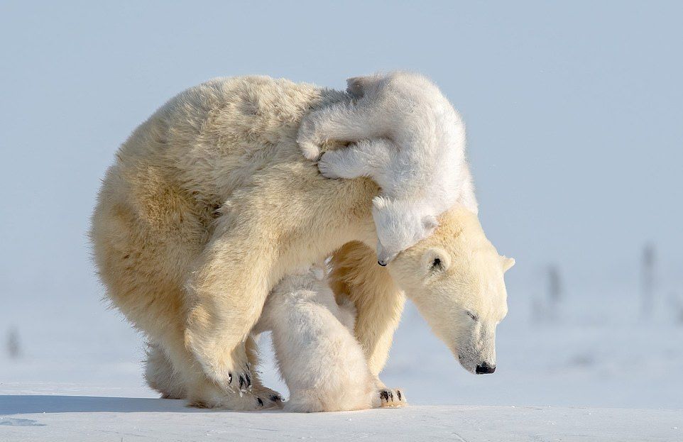 Прелестный белый медвежонок был запечатлен падающим со своей мамы в снег. Падение трехмесячного детеныша стало неожиданностью для его брата, когда они играли и карабкались по матери, изучая ценные уроки выживания. Фотограф Хун Цуй (Hung Tsui) запечатлел трогательную встречу между семейством белых медведей в Национальном парке Вапуск, Канада.