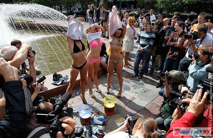 Суть мероприятия заключалась в том, что девушки предлагали случайным молодым людям выливать пенный напиток в специальные ведра, а в награду за своеобразное пожертвование поклонницы президента снимали с себя одежду. За 3 литра пива, оказавшегося в ведре, девушки готовы были лишиться шорт, а за 6 литров - майки.