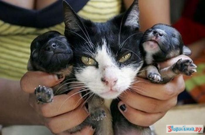 но в остальном похожий на щенка, сосет молоко у кошки, а кошка в это время вылизывает его как родного котенка.