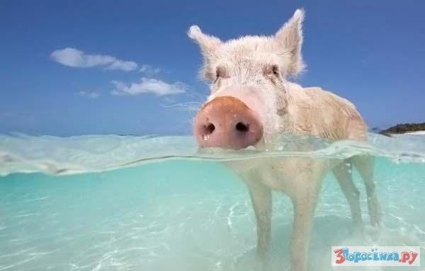 На пляжах Big Major Spot Island, Багамские острова, семья коричневого и розового кабанов и поросят свободно живут и нежатся на белом песчаном пляже и купаются в море с превиликим удовольствием. Подводный фотограф Эрик Чэн наткнулся на этих необычных жителей во время дайвинг экспедиции в этот район и решил запечатлить на память столь необычных постояльцев для такого места.