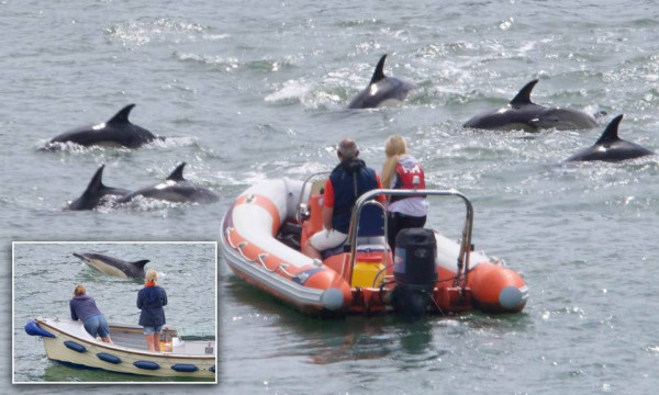 Группа молодых моряков наслаждалась интересным зрелищем, когда стая дельфинов подплыла прямо к их лодке в тихой гавани. Они остались в восторге, когда в субботу утром дельфины появились в реке Дарт между Дартмутом и Кингсвиром, Девон. Не испугавшись встречи с людьми, дружелюбные млекопитающие подплыли прямо к ним и, казалось, очень удобно окружили шлюпки. Фотограф Энди Кайл запечатлел этот момент и заметил, что водные млекопитающие оставались рядом с моряками более часа, пока они охотились за свежей рыбой.