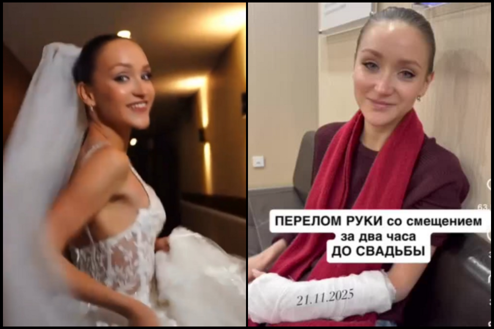 Девушка бежала в длинном свадебном платье по коридору отеля, запуталась в подоле и упала.