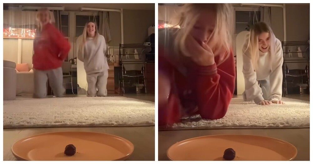 Две подруги участвовали в интернет-челлендже: на коленях и со связанными руками нужно было добраться до тарелки с едой. Одна из девушек потеряла равновесие и упала лицом вперед.