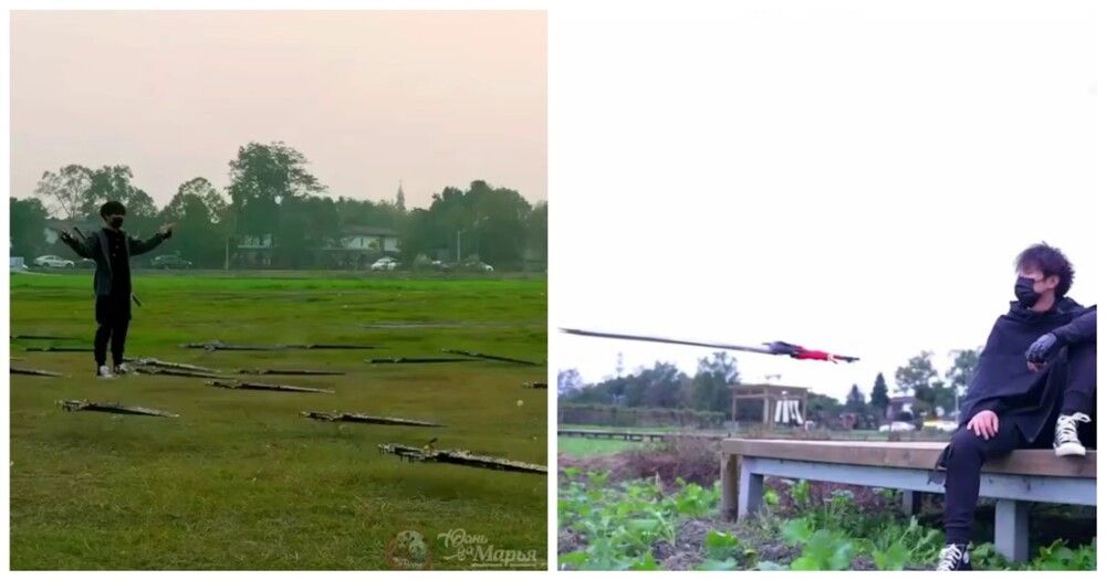 Студент-инженер из Китая показал летающие мечи. Они  управляются через специальные перчатки, а летают на мини-дронах. Также он продемонстрировал, как пролетает небольшое расстояние на мече-платформе.