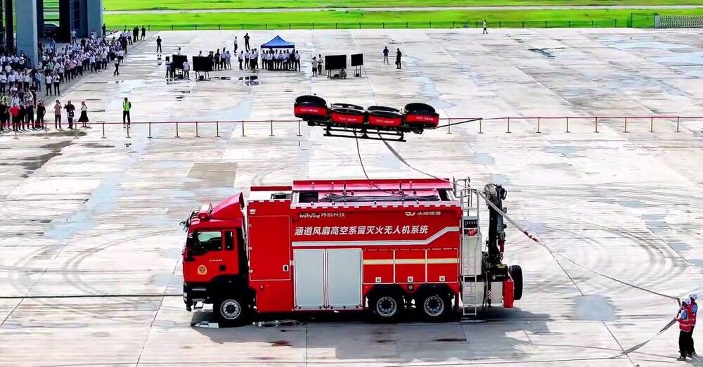 Китайцы показали пожарную машину со встроенным в крышу дроном для тушения высотных зданий. Дрон способен подниматься на высоту до 200 метров и распылять воду на 45 метров.