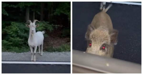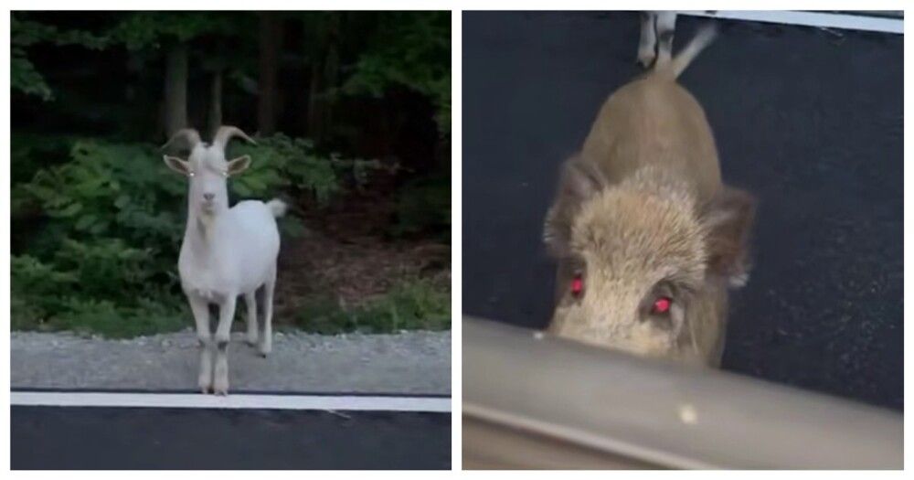 Польский автолюбитель встретил необычную парочку в лесистой местности. Сперва из леса вышел белый козёл, а следом за ним - кабан.