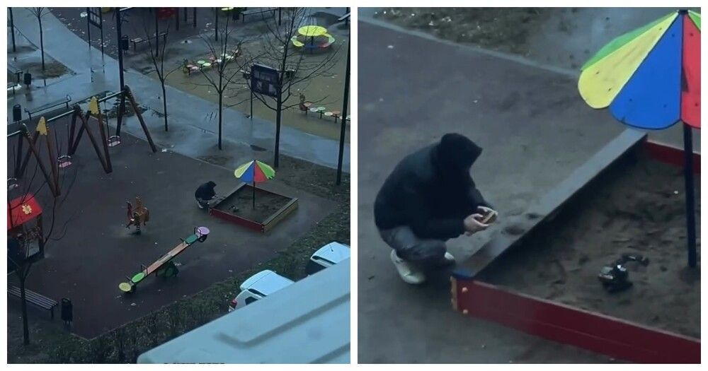 Пока жена занята ребёнком дома, её муж решил "на минутку" протестировать игрушечный экскаватор на пульте управления и в итоге оказался сидящим в детской песочнице, полностью увлечённым процессом.