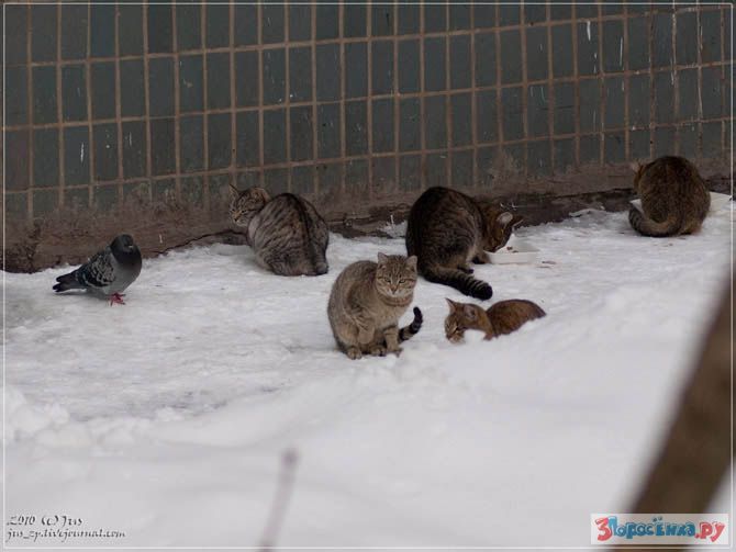 Более наглую птицу еще нужно поискать. Небольшая тусовка кошек/котов, хвостов в пять-шесть, мирно полдничает чем бог послал в местах кормления добрыми бабушками, как вдруг из-за угла, вразвалочку, подходит это чудо в перьях и происходит буквально следующий диалог: