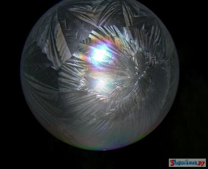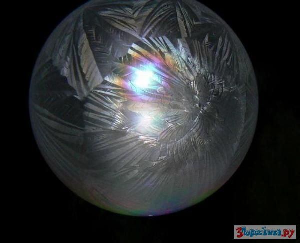 Мыльные пузыри замерзают при температуре около -7 С. Чтобы мыльный пузырь быстро превратился в ледяной шарик, достаточно бросить на него снежинку. Снежинка соприкоснется с пузырем и от нее во все стороны побегут бусинки льда. Причем тип кристаллизации будет такой же, как и у снежинки, то есть можно выбрать его заранее, отлавливая снежинки и рассматривая их на варежке...